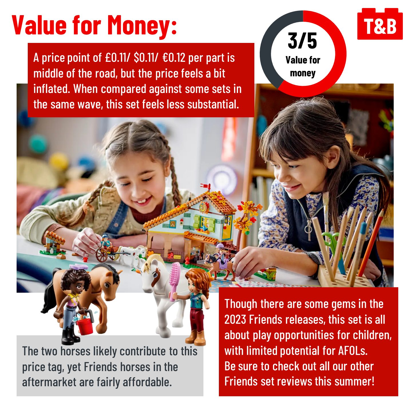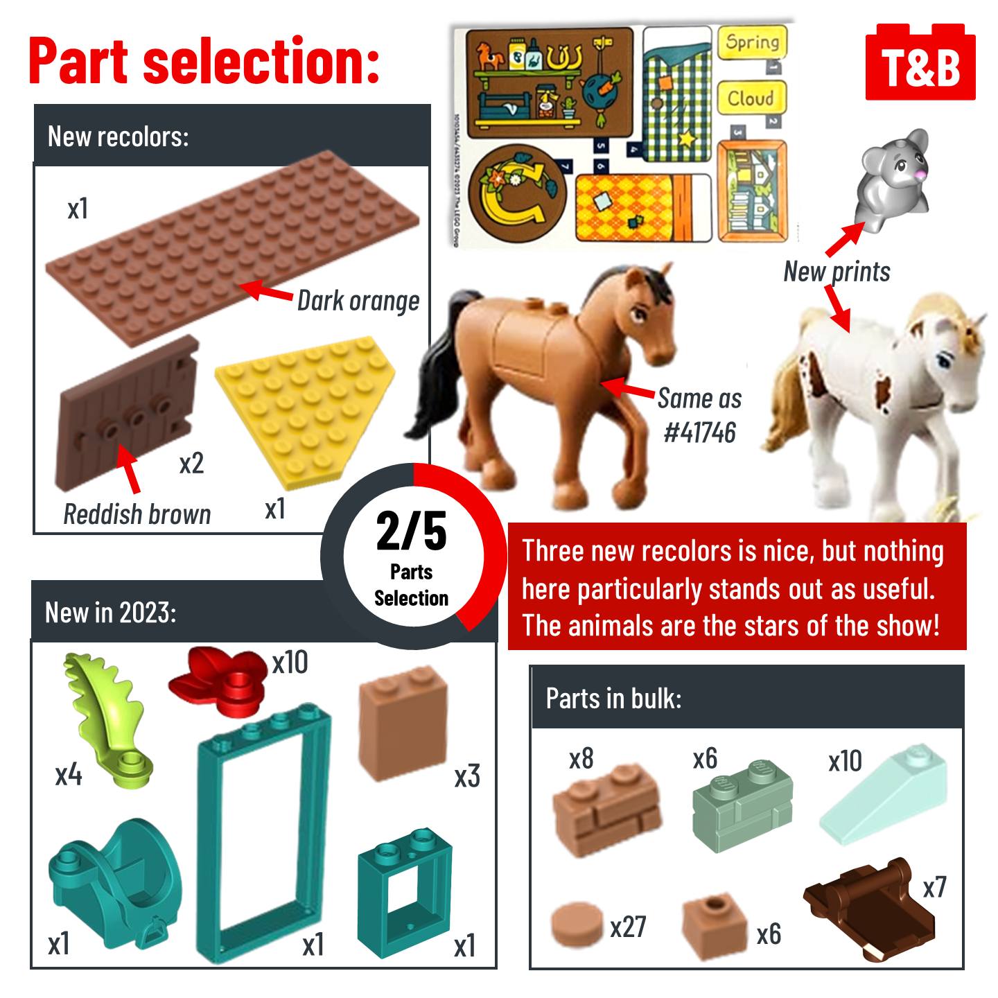 The next set we’re reviewing in the Friends summer wave might not meet the high standards of some other sets in the wave, but it is a cute playset for kids! LEGO has been producing great new animal molds and prints, so what do you think about the new prints on the animals in this set?