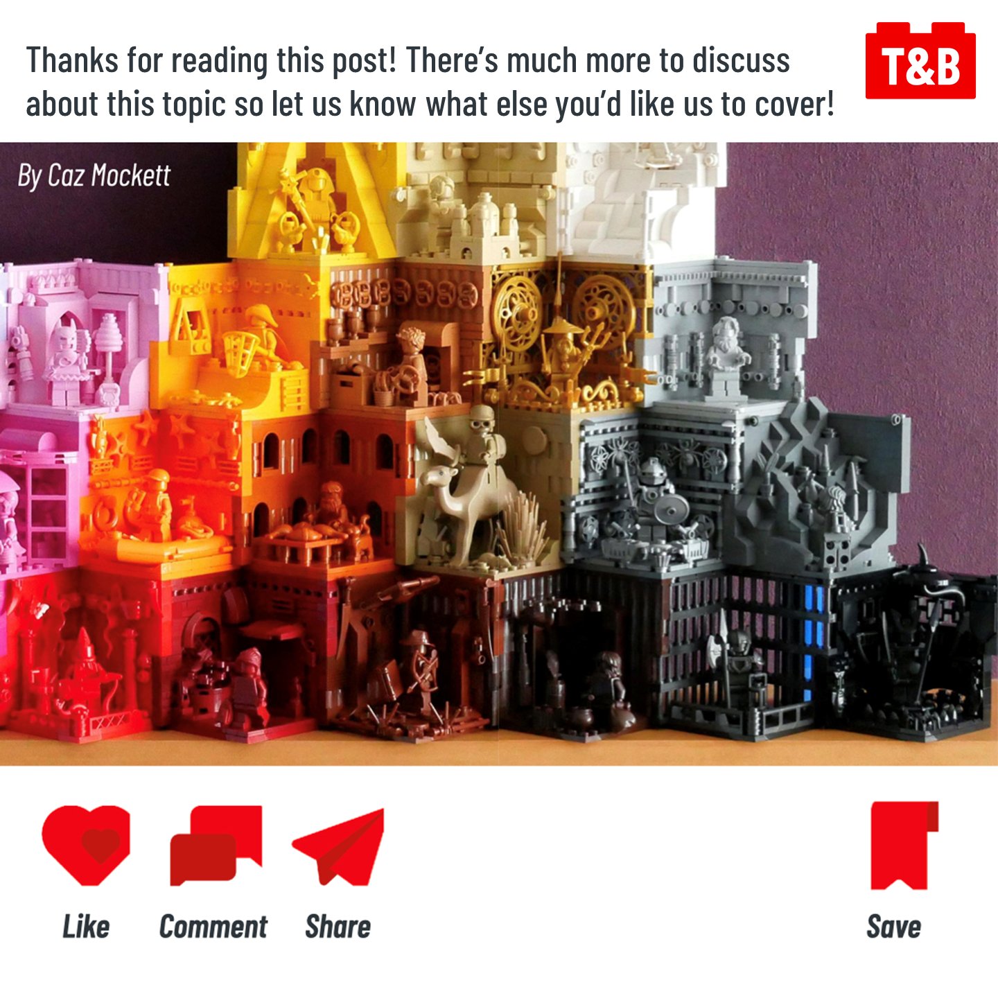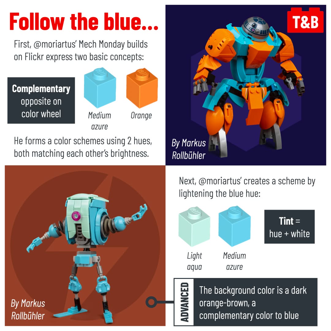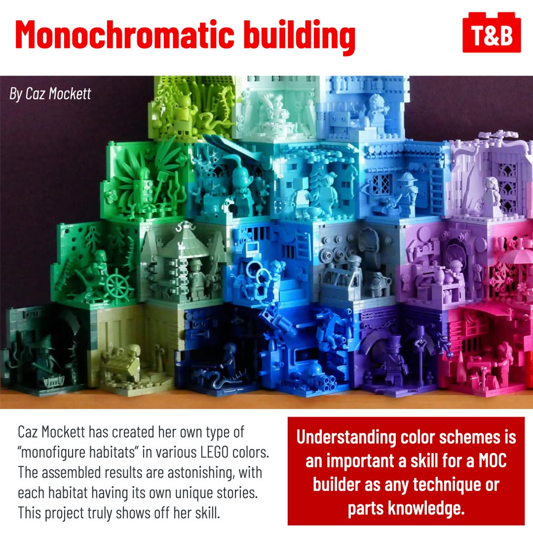 Additional takeaways from this post that are subtly hinted throughout the post, such as mixing complementary colors to make brown, but we also highlight something important to consider outside of your builds: their background. How can the background do more for you than just a blank surface? Can you actually use it to enhance the colors or the texture of your builds? This can help your builds look great and stand out in competitions, on photos feeds, or in your portfolio!