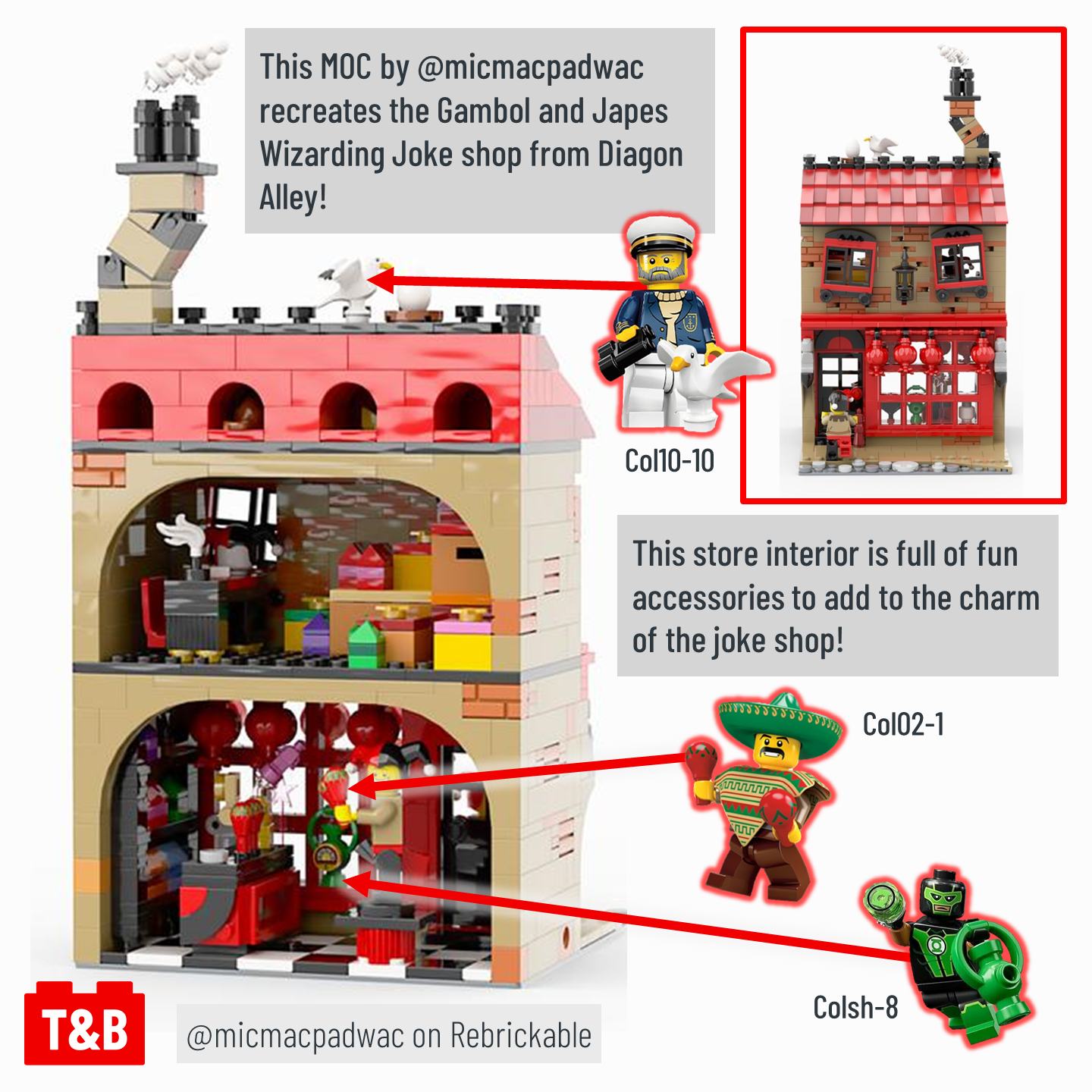 @micmacpadwac on Rebrickable – https://rebrickable.com/mocs/MOC-85034/micmacpadwac/gambol-and-japes-wizarding-joke-shop-in-diagon-alley/#comments