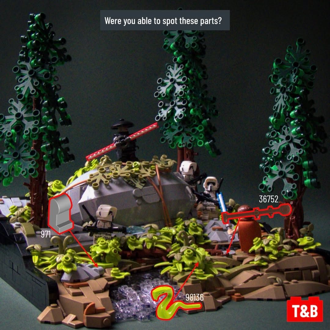 In his “Confrontation on Krant” MOC, @choopyjups takes us to the forest planet of Krant where a young Padawan is about to face the Fifth Brother. In this post, we will look at some of the techniques used by the builder to make this vignette so moody and realistic.