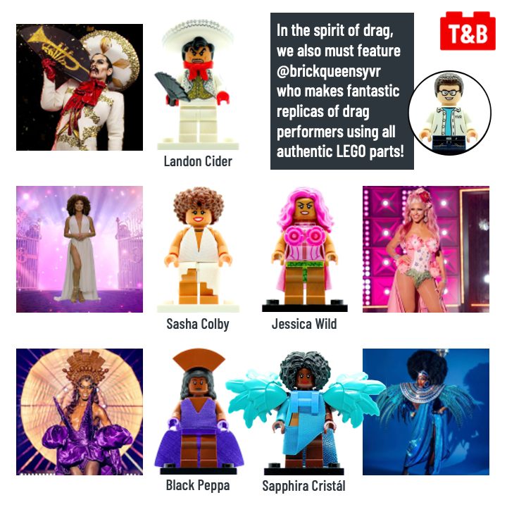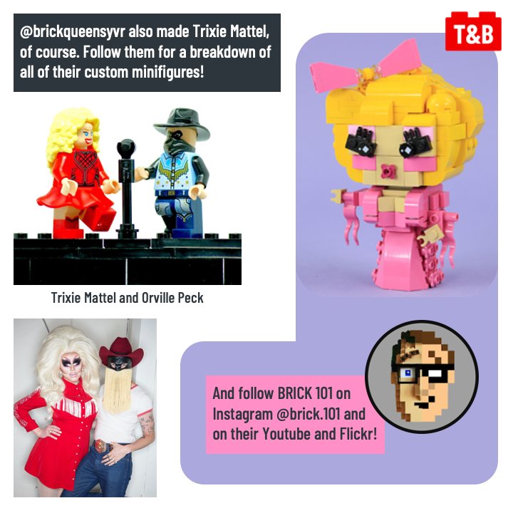 To celebrate Pride Month, we wanted to showcase builds that represent superheroes from the queer community – drag performers! Trixie Mattel is one of the most famous drag queens in the world, and BRICK 101 on Flickr makes an incredible Brickheadz-style MOC that captures all of her signature features. We also highlight @brickqueensyvr who creates fabulous custom minifigures of our favorite drag performers. Happy Pride!