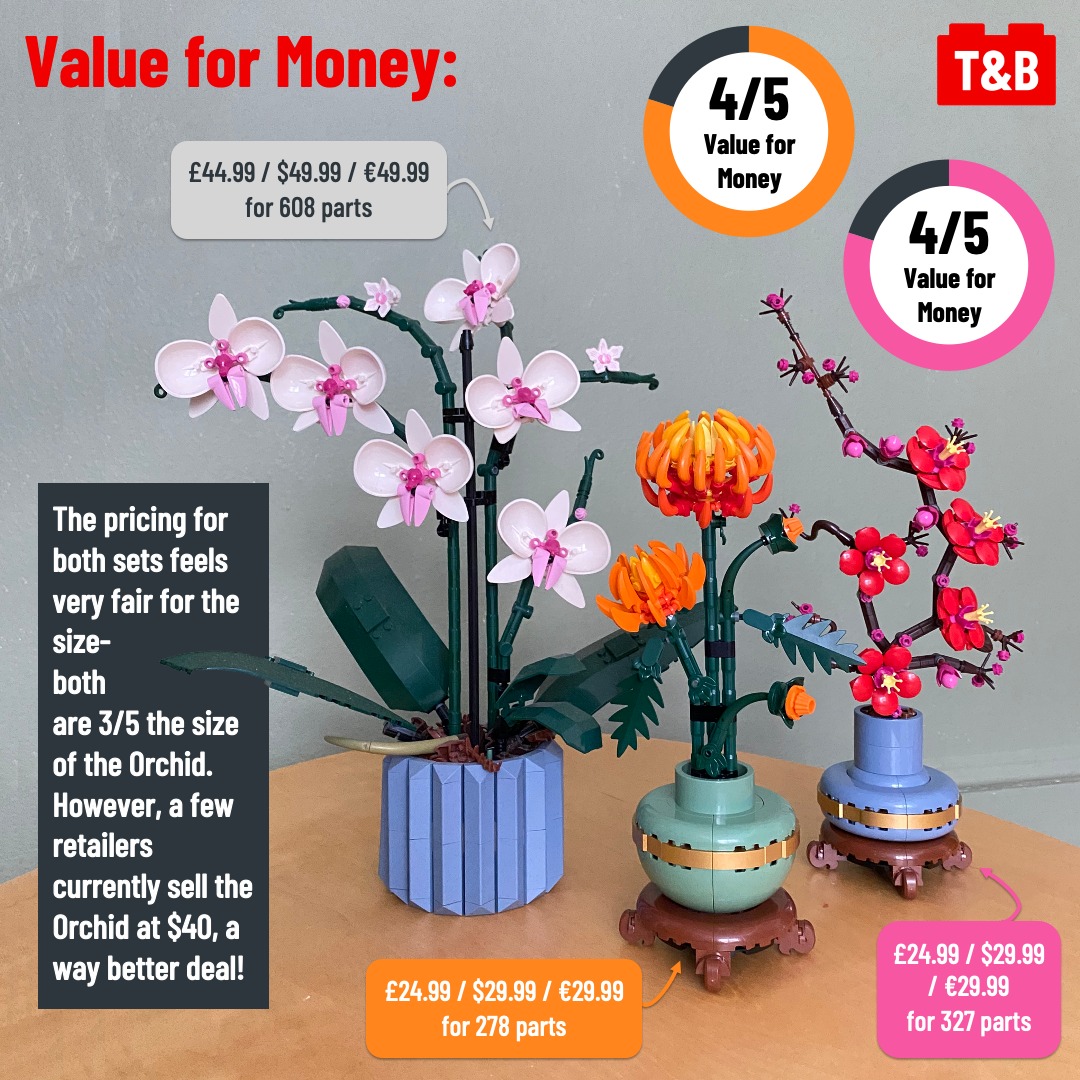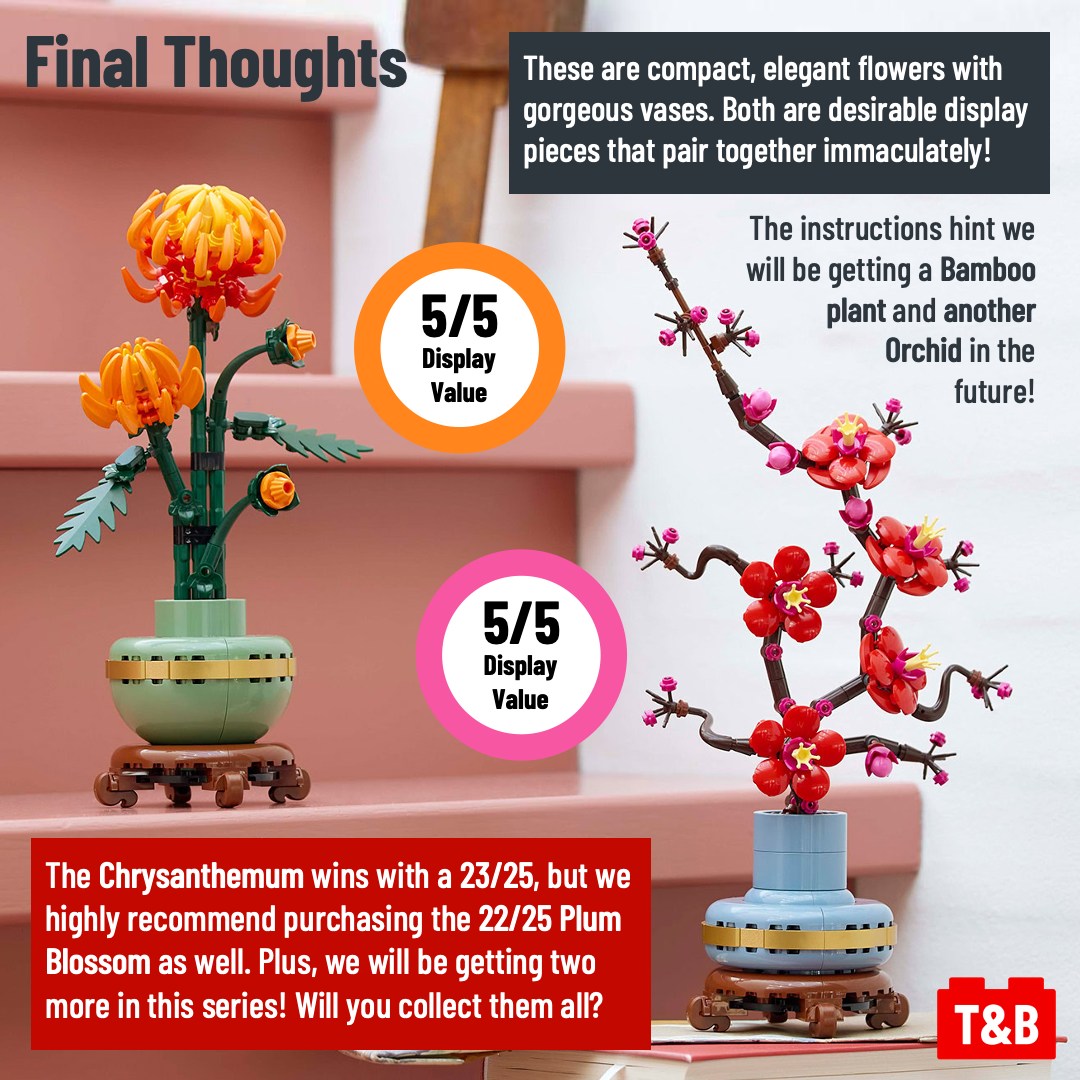 Double review time! We compare the newest LEGO plants, part of a future series of 4 that will also include Bamboo and another Orchid. We find that the Chrysanthemum is superior to the Plum Blossom in technique, but the latter wins in accuracy. Overall, both are truly excellent sets, affordable and perfectly compact. Do you agree with our reasonings? Let us know in the comments!