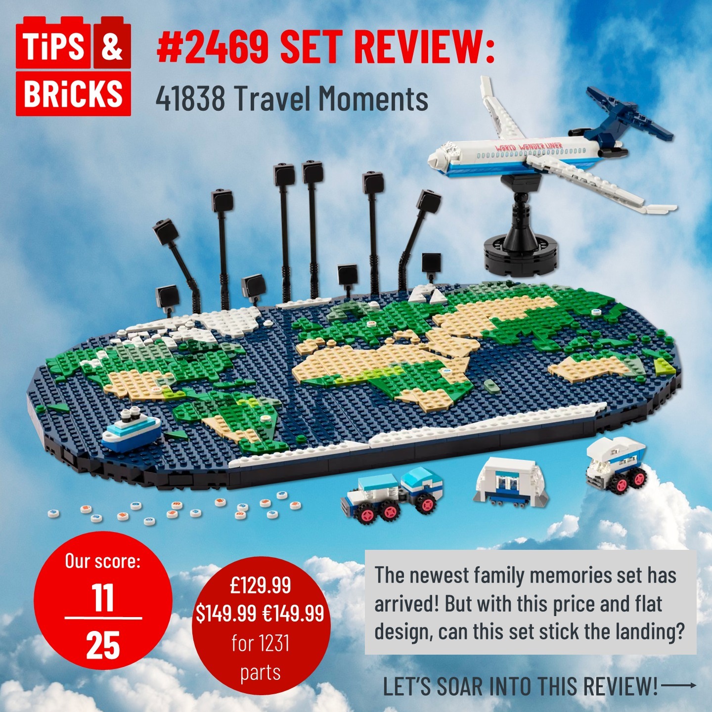 In today’s review, we’re heading to the newest in the families sub-theme, the Travel Moments set! This new set allows you display photos and souvenirs from holidays behind a plane and map build and was inspired by the winning build from LEGO Masters USA Season 4.