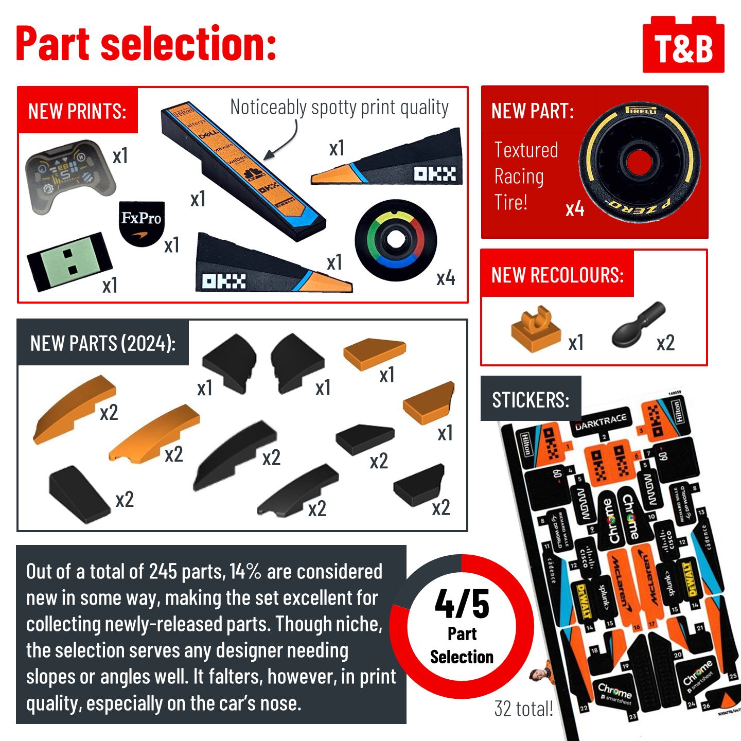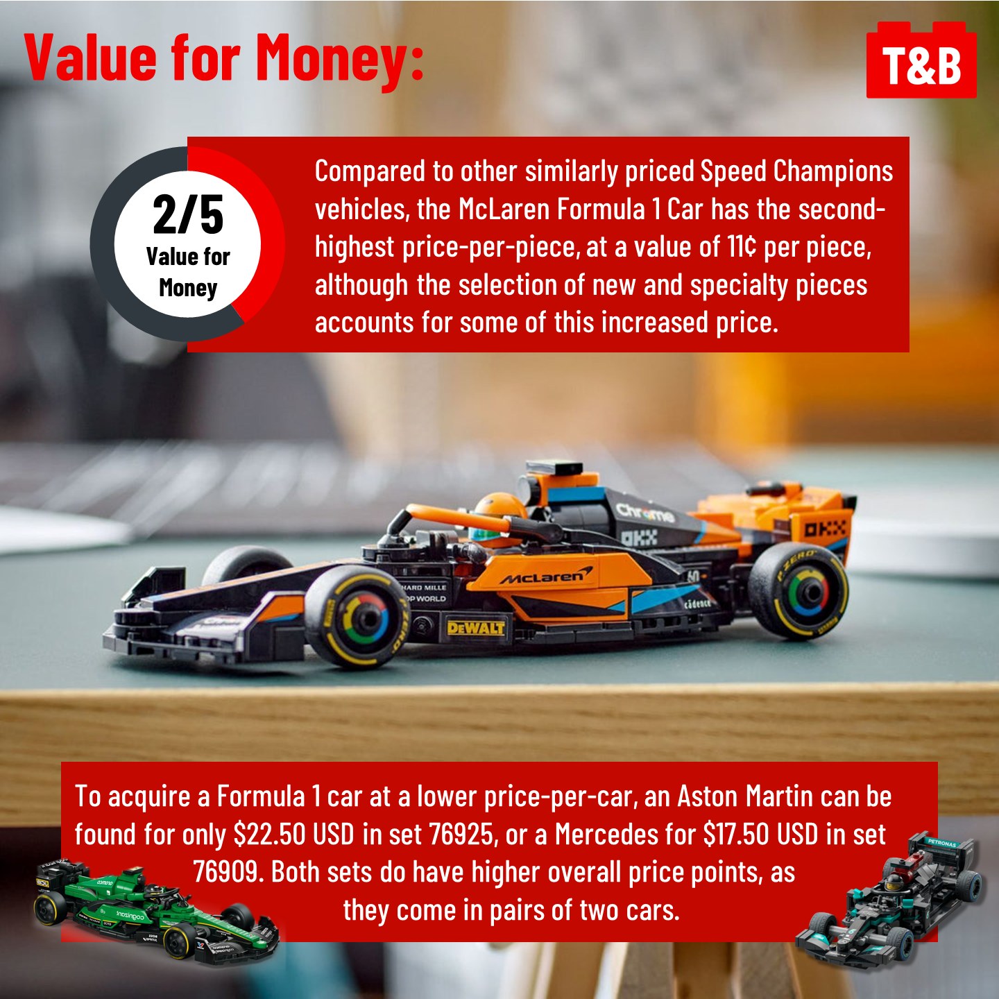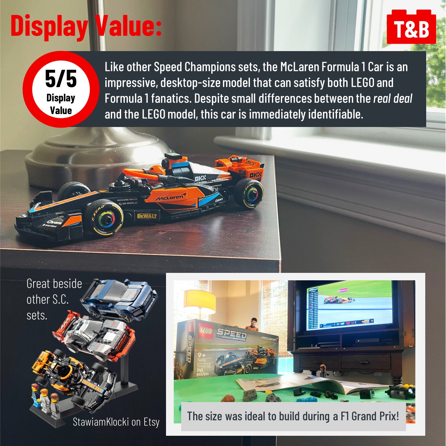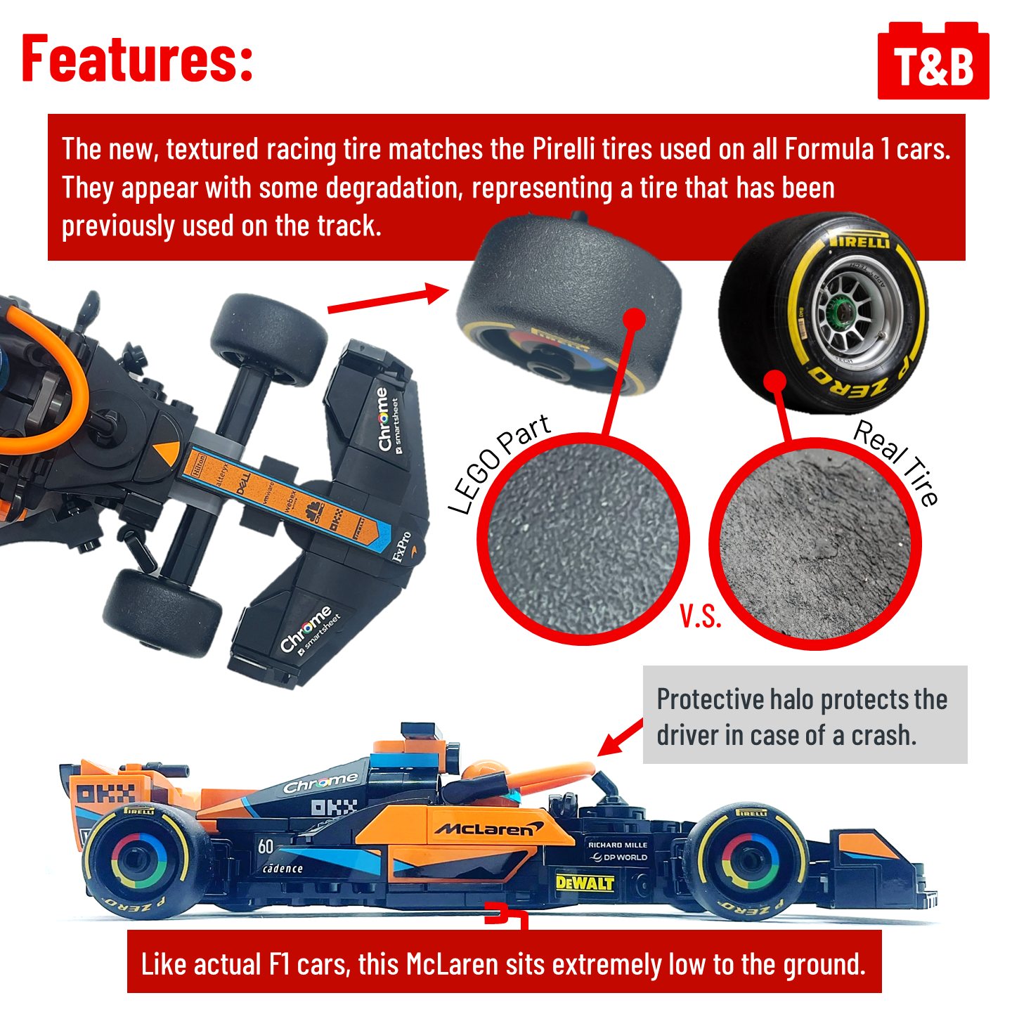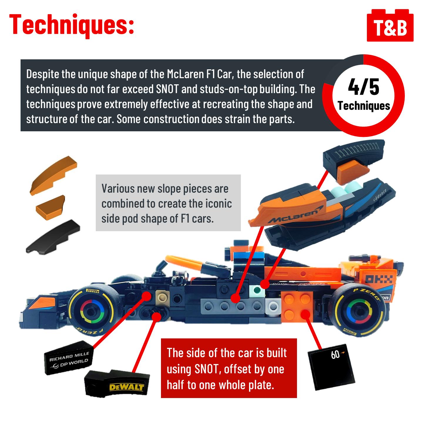 It’s race day at the inaugural Formula 1 Tips&Bricks Grand Prix, where we determine whether the 2023 McLaren from set 76919 is up to the challenge! This set ranks high as one of the most accurate official LEGO recreations of an F1 car, surprisingly without many complicated techniques. A combination of NPUs and LEGO math makes for a sleek and clean-lined design that works great as a display piece. It also introduces a new wheel piece, representing the official F1 Pirelli tires. Although it does have a high price per piece and falters in print quality, this set would take Pole position for any F1 fan.