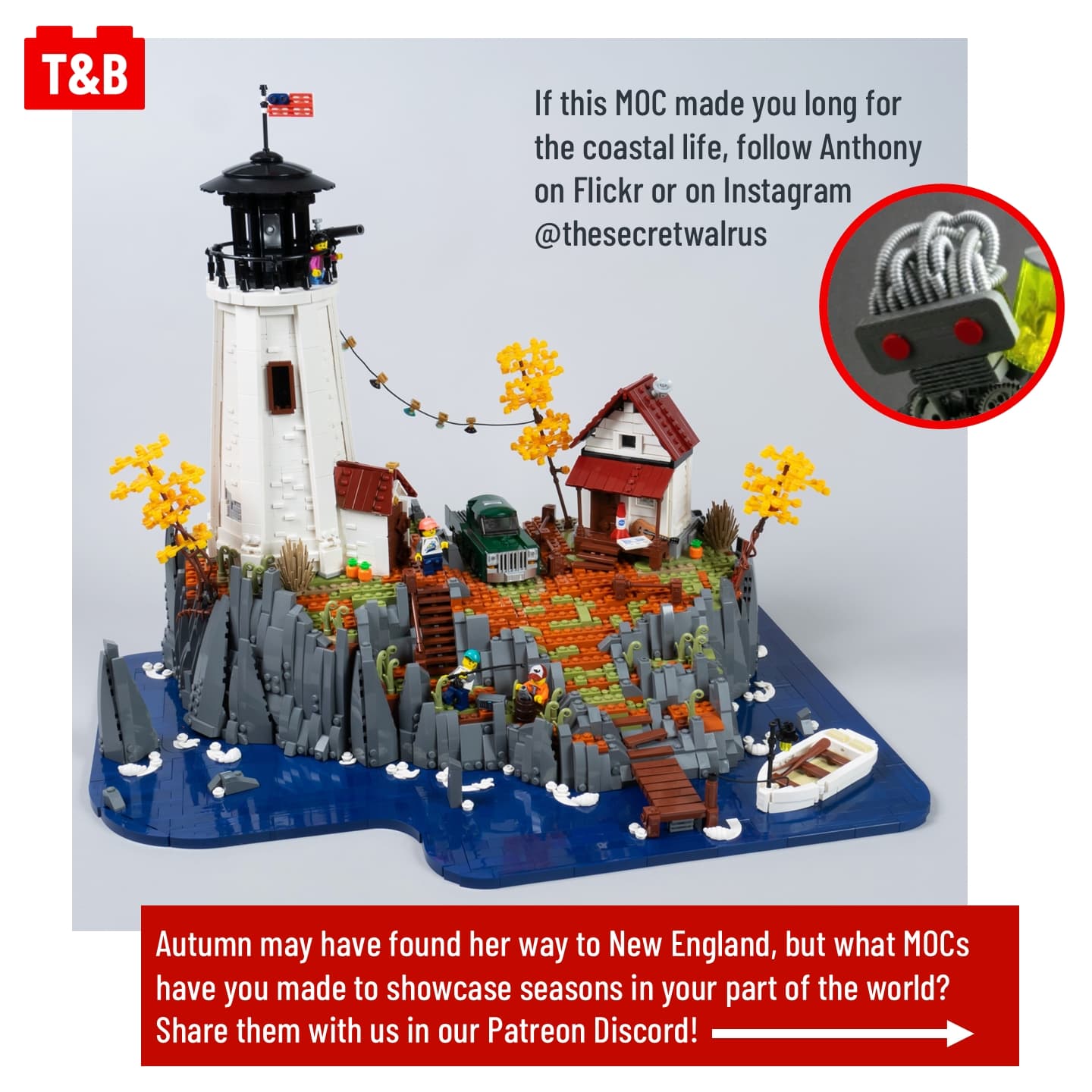 Autumn is now in New England and this MOC is a perfect snapshot of the season! Stay warm on the rocky coast and travel to the top of the lighthouse for a view of the entire scene. What seasonal MOCs have you made from your part of the world? Share with us!