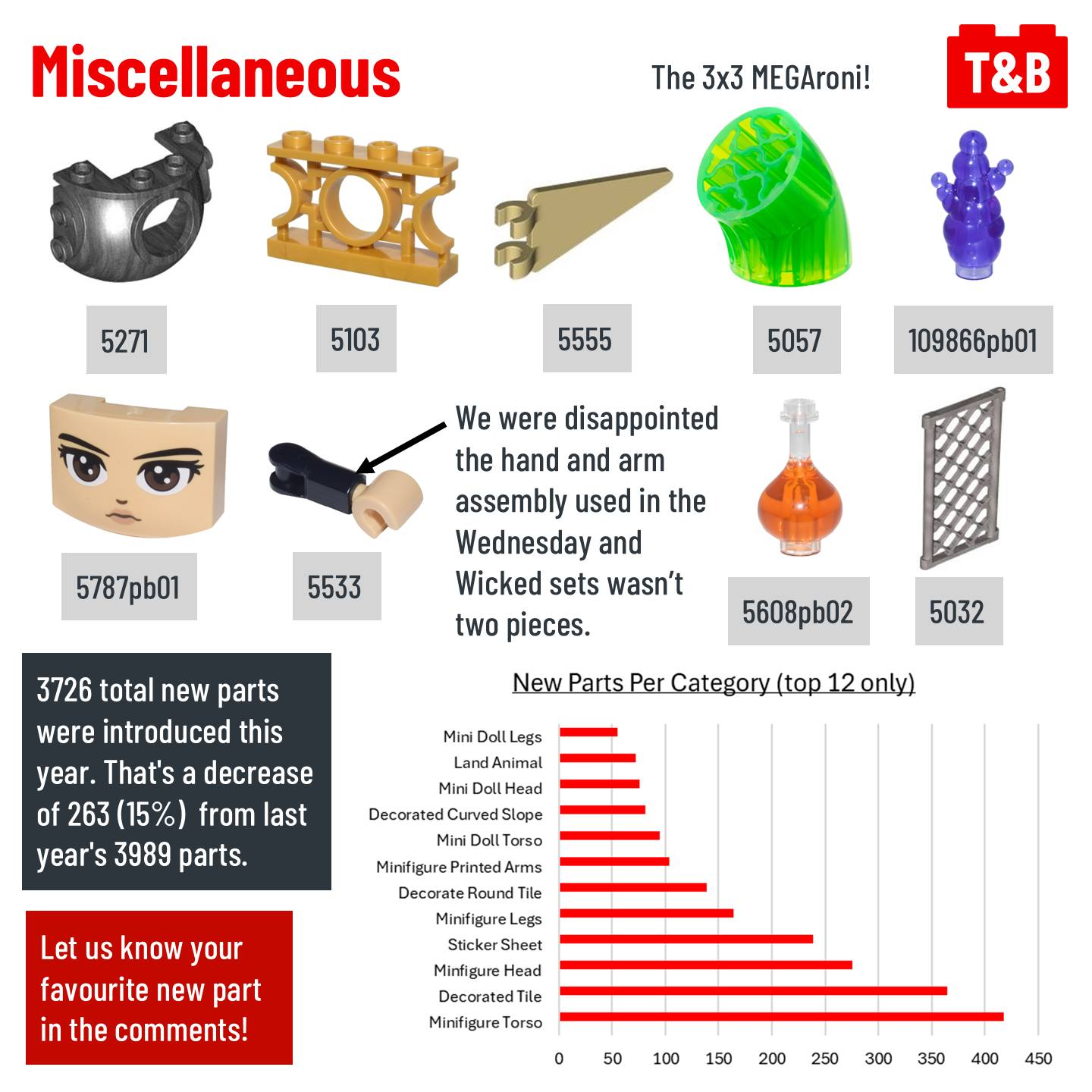 In total, 3726 new parts were introduced this year. That’s 263 less than last year, a 15% decrease! Although the number of new pieces have decreased, the usefulness and uniqueness of the parts is still awesome!