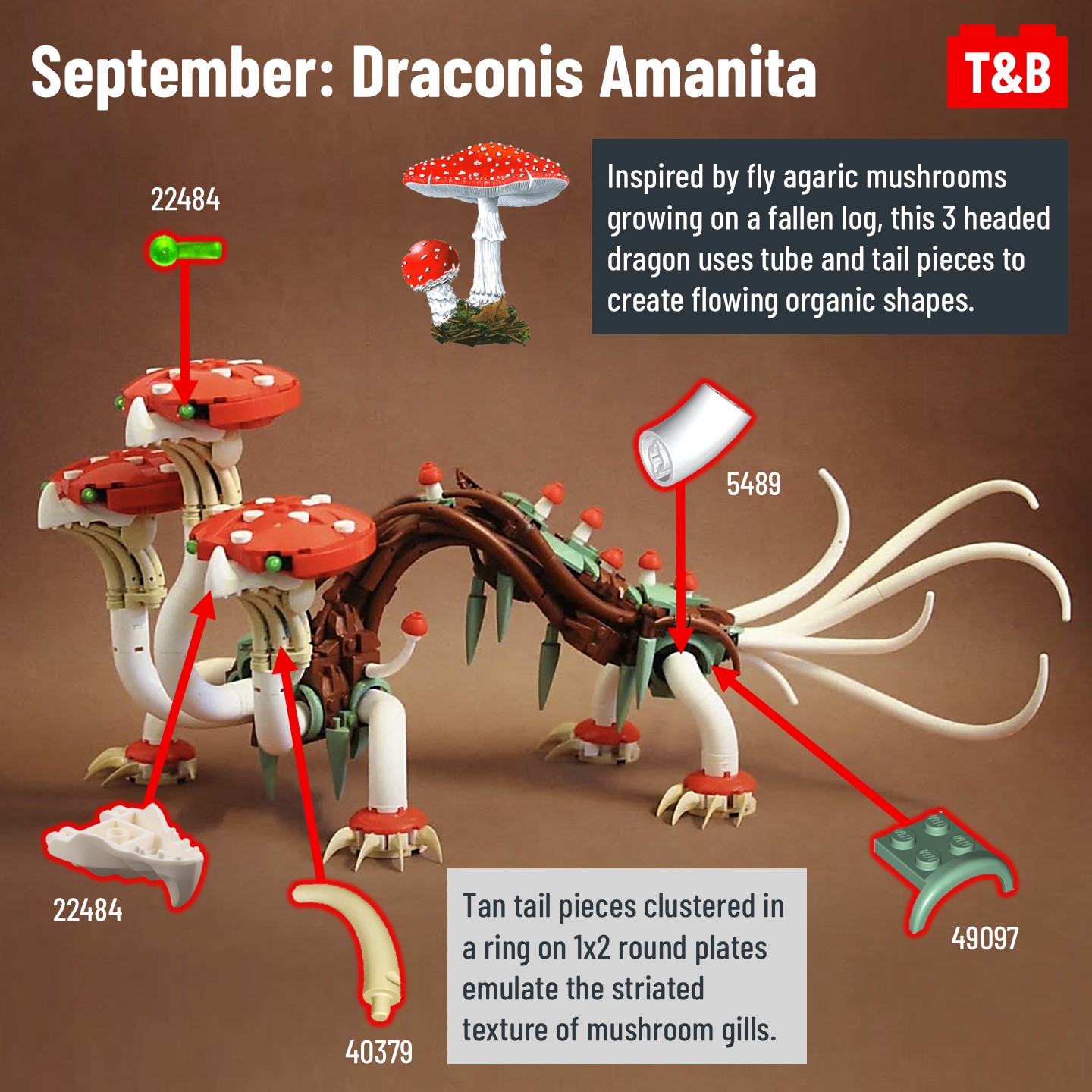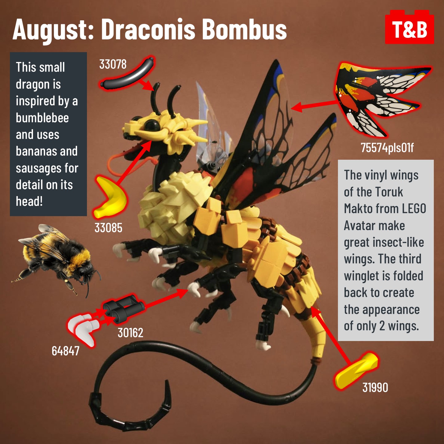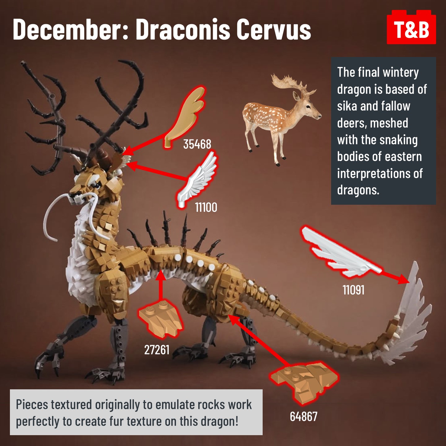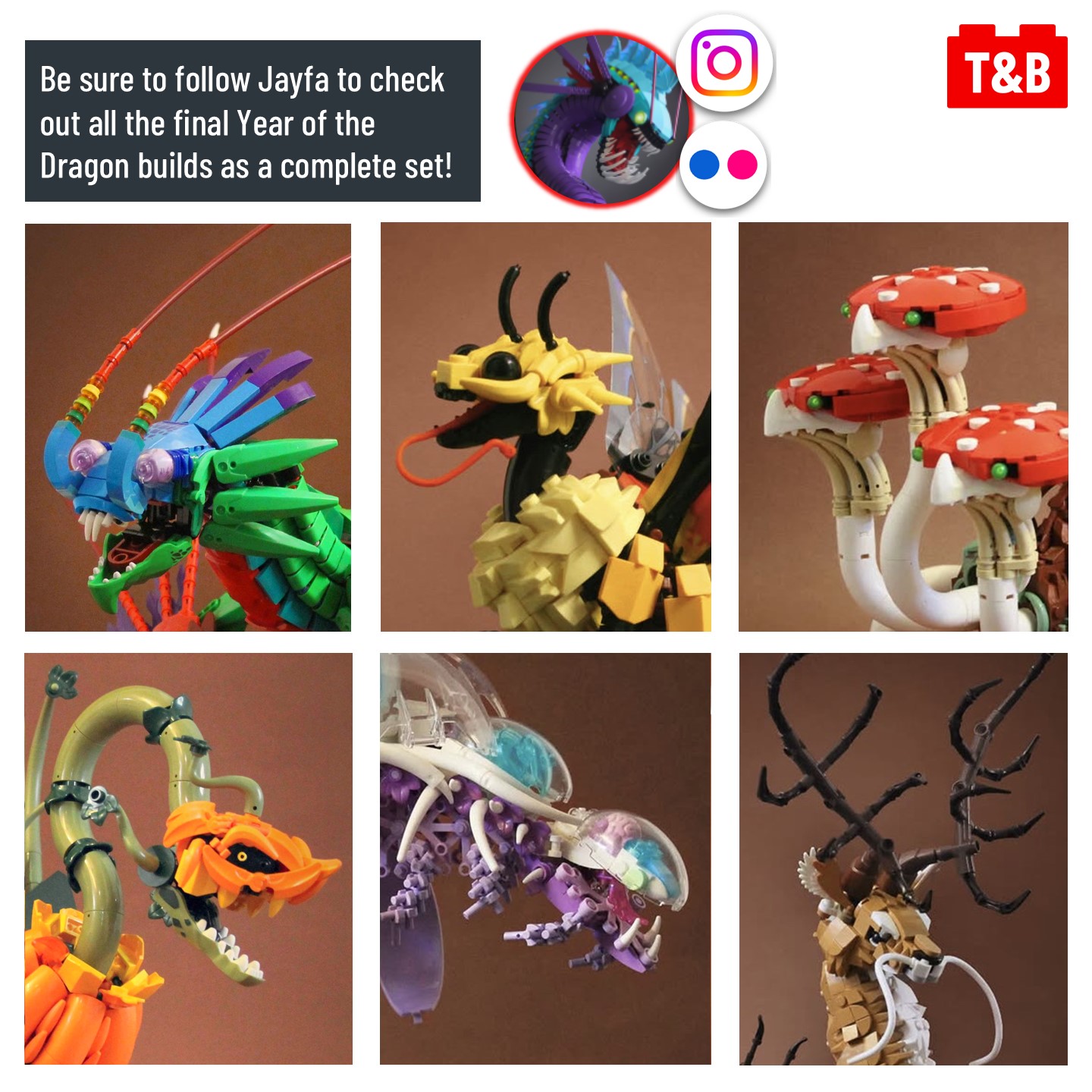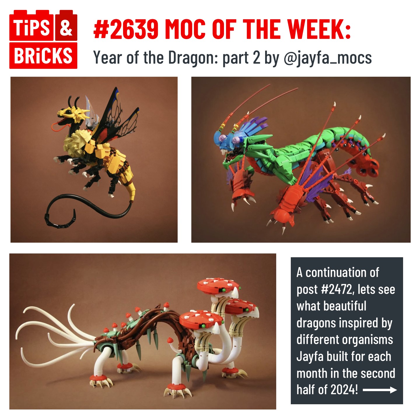 Carrying on from post #2472, @jayfa_mocs has completed his challenge to build a unique dragon every month of 2024! Now that it’s complete, let’s take a look at the 6 latest incredible builds! From fungi, to bees, to deer, all these dragons are inspired by some real-world thing! @jayfa_mocs is a master in NPU and complex techniques, so let’s break it down!