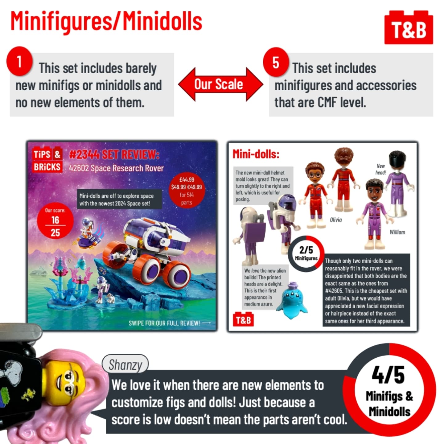 ⭕️ Minifigs: We love it when there are new elements to customize figs and dolls! Just because a score is low doesn’t mean the parts aren’t cool.