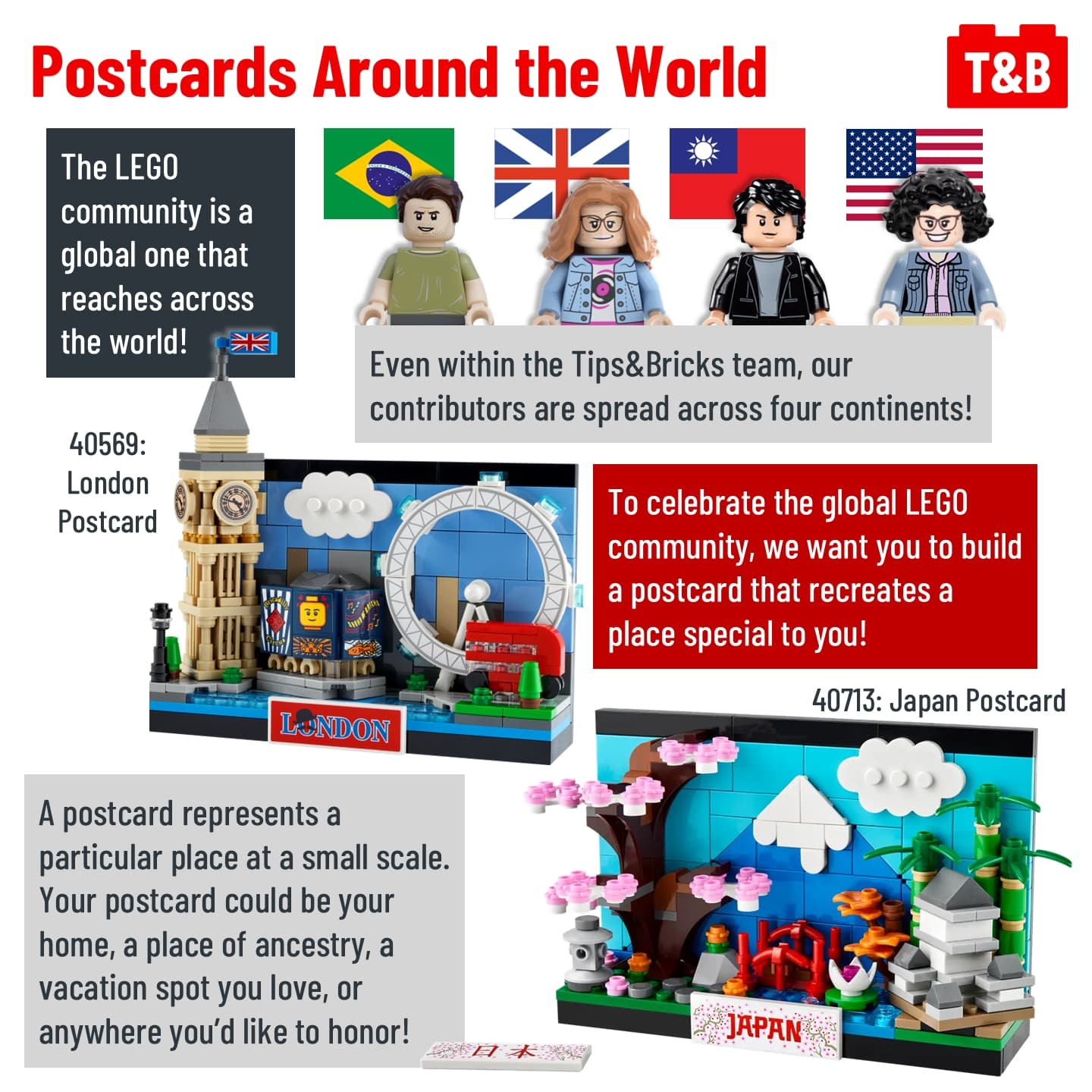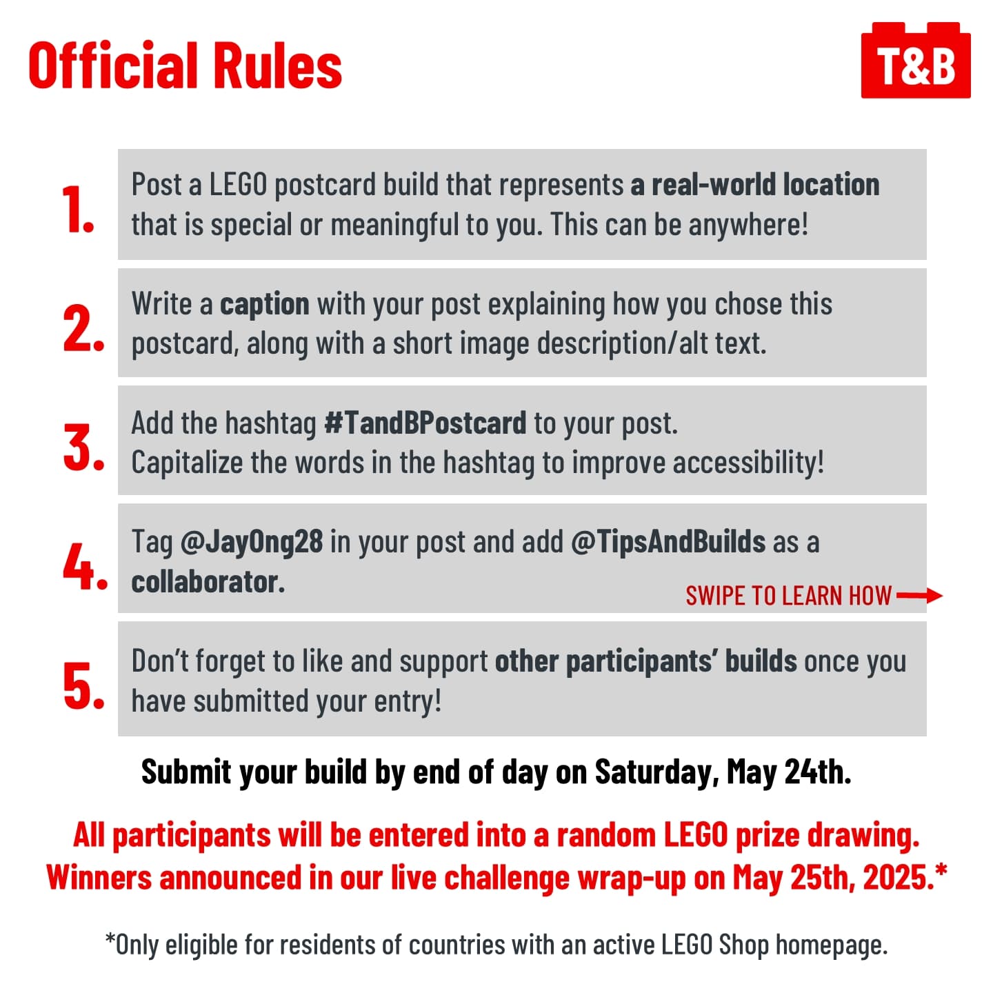 Official rules require you to share your postcard build here on Instagram, write a caption explaining your postcard along with an image description, add #TandBPostcard to your caption, tag @jayong28 , and, most importantly, to add @TipsandBuilds (not @tipsandbricks) as a collaborator. Adding the collaborator is the most important step so that we don’t miss your build!