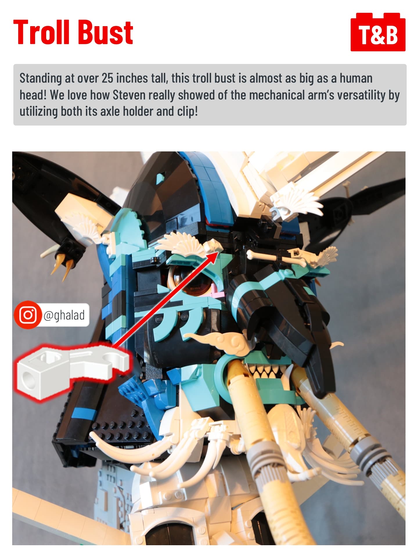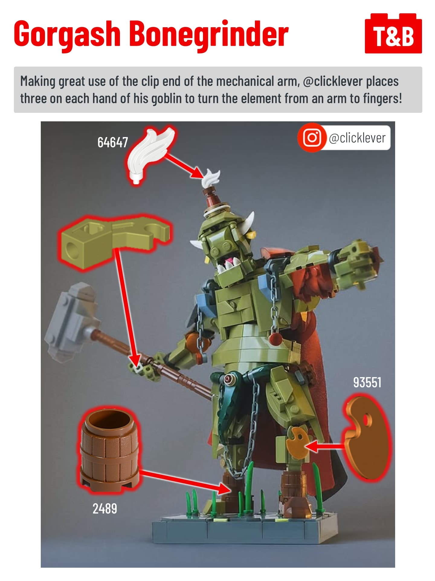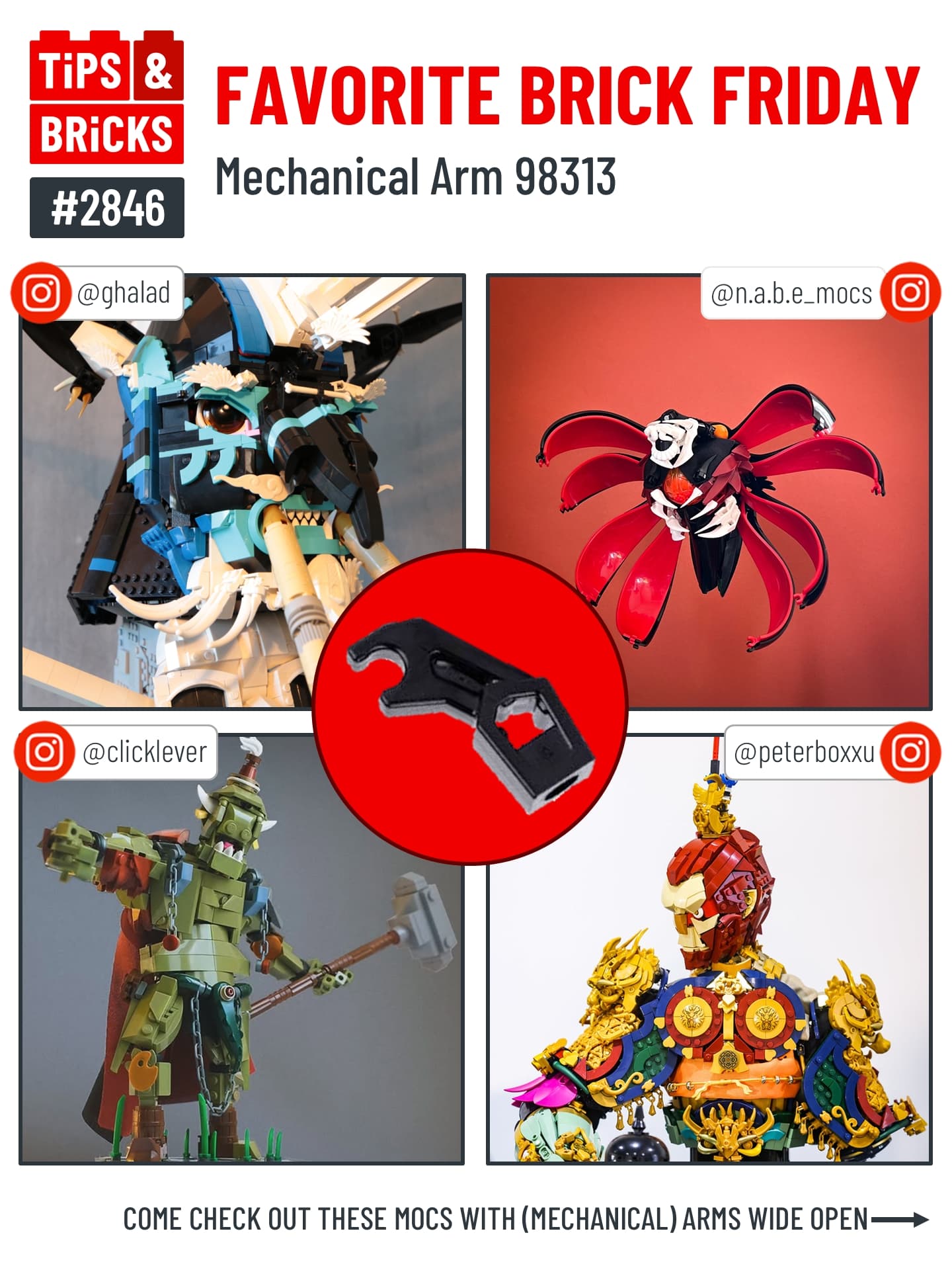 Need a hand? Don’t worry, we’ve got you covered with today’s post on element 98313, the mechanical arm. Either used as its name implies, fleshing out an ogre hand, or more subtly as a mounting point for adornment, this element is favored for its many connection points and fun angle! What’s your favorite way to use element 98313, the mechanical arm?