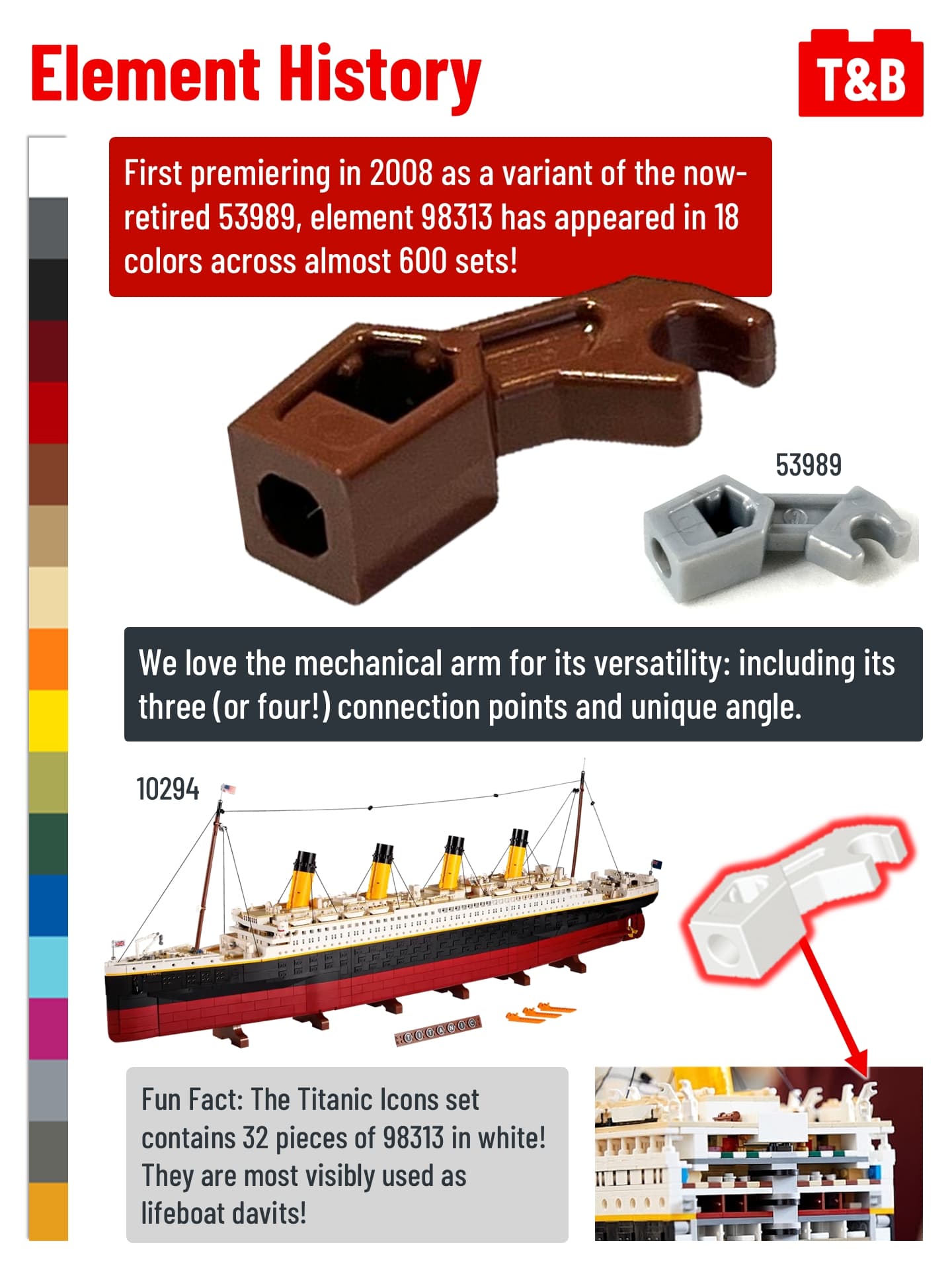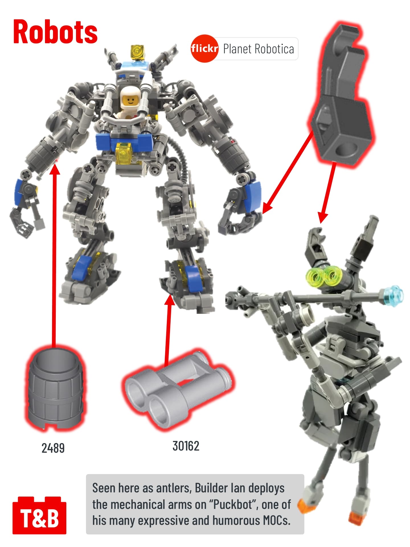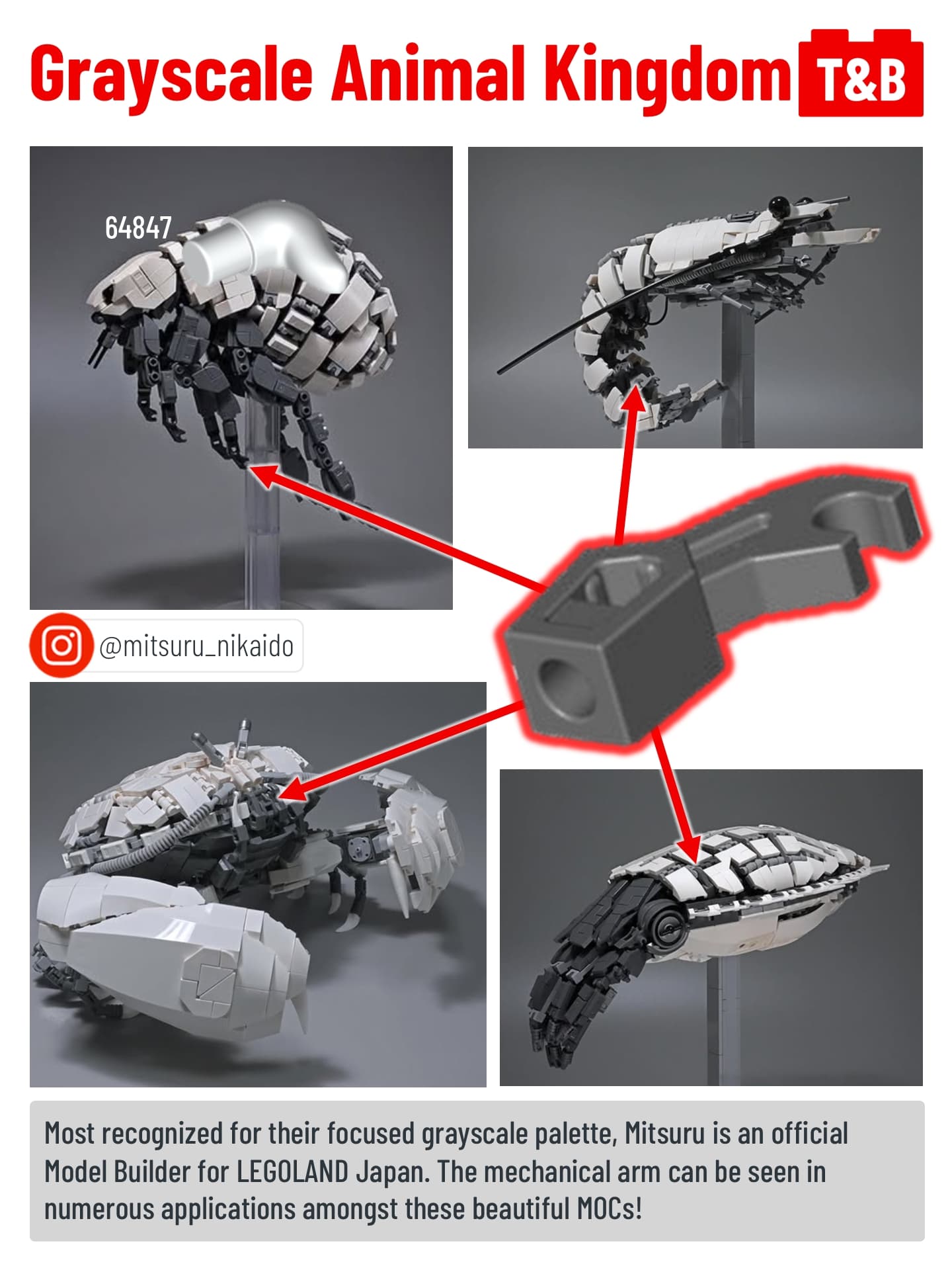 Need a hand? Don’t worry, we’ve got you covered with today’s post on element 98313, the mechanical arm. Either used as its name implies, fleshing out an ogre hand, or more subtly as a mounting point for adornment, this element is favored for its many connection points and fun angle! What’s your favorite way to use element 98313, the mechanical arm?