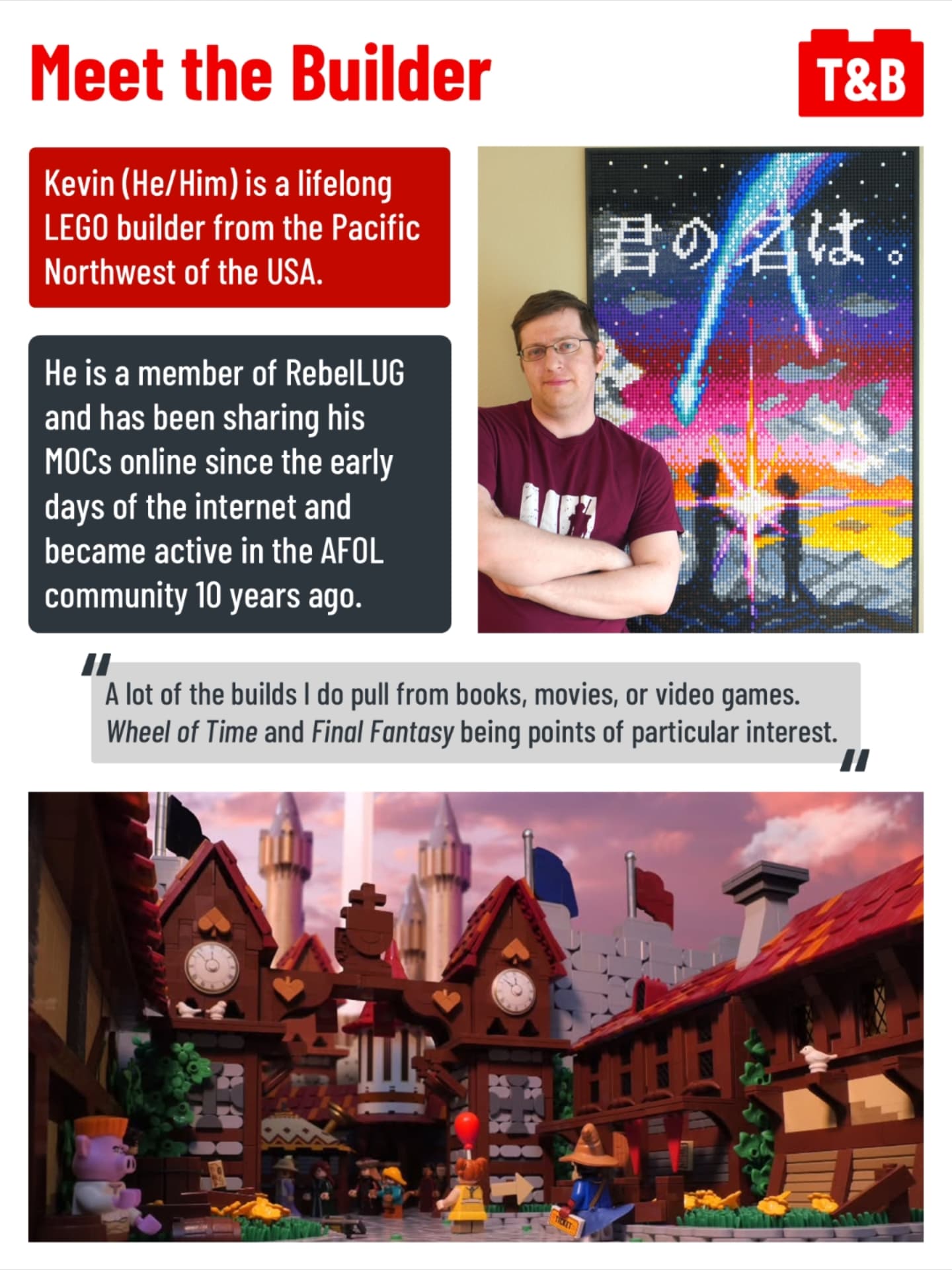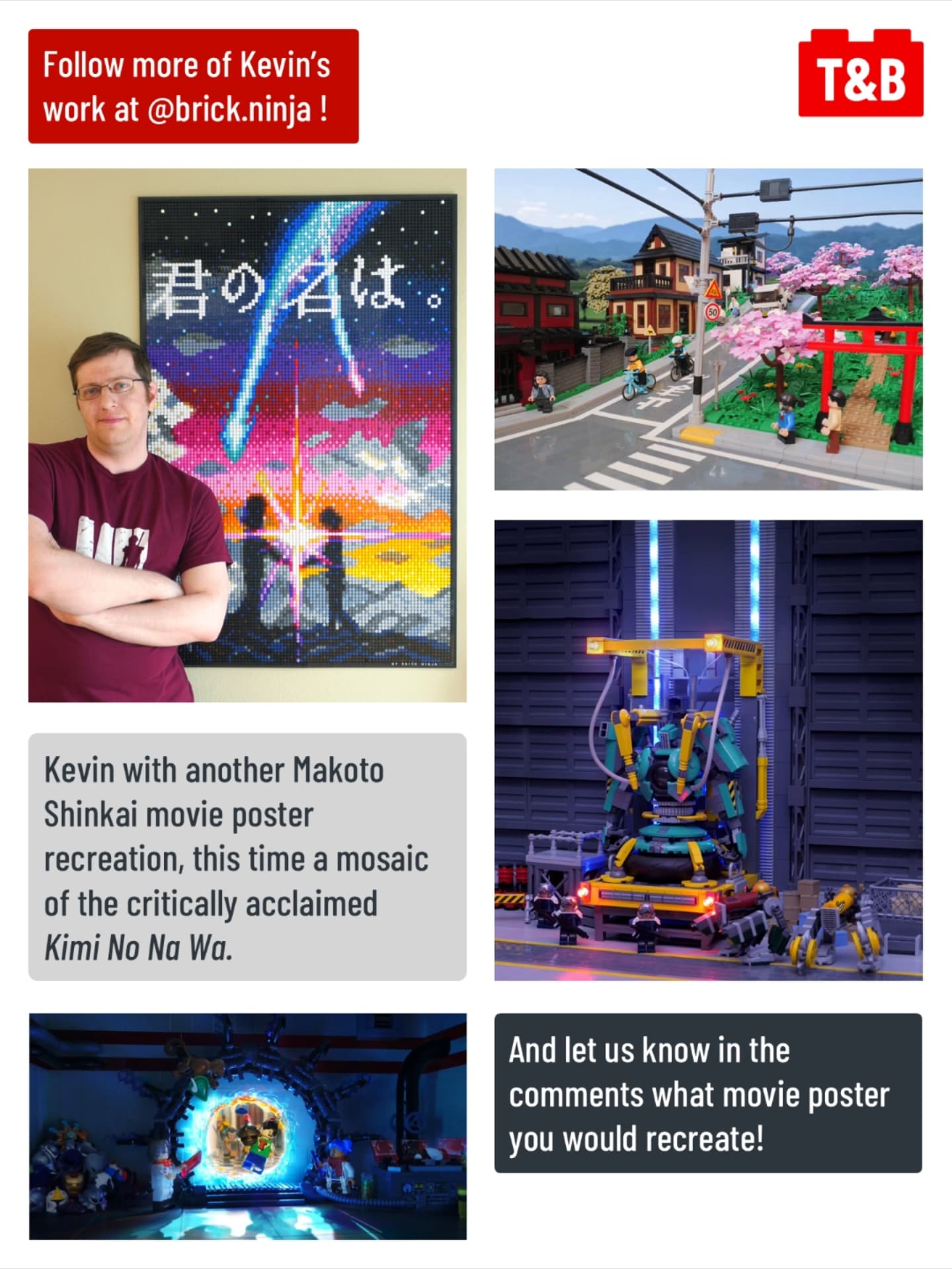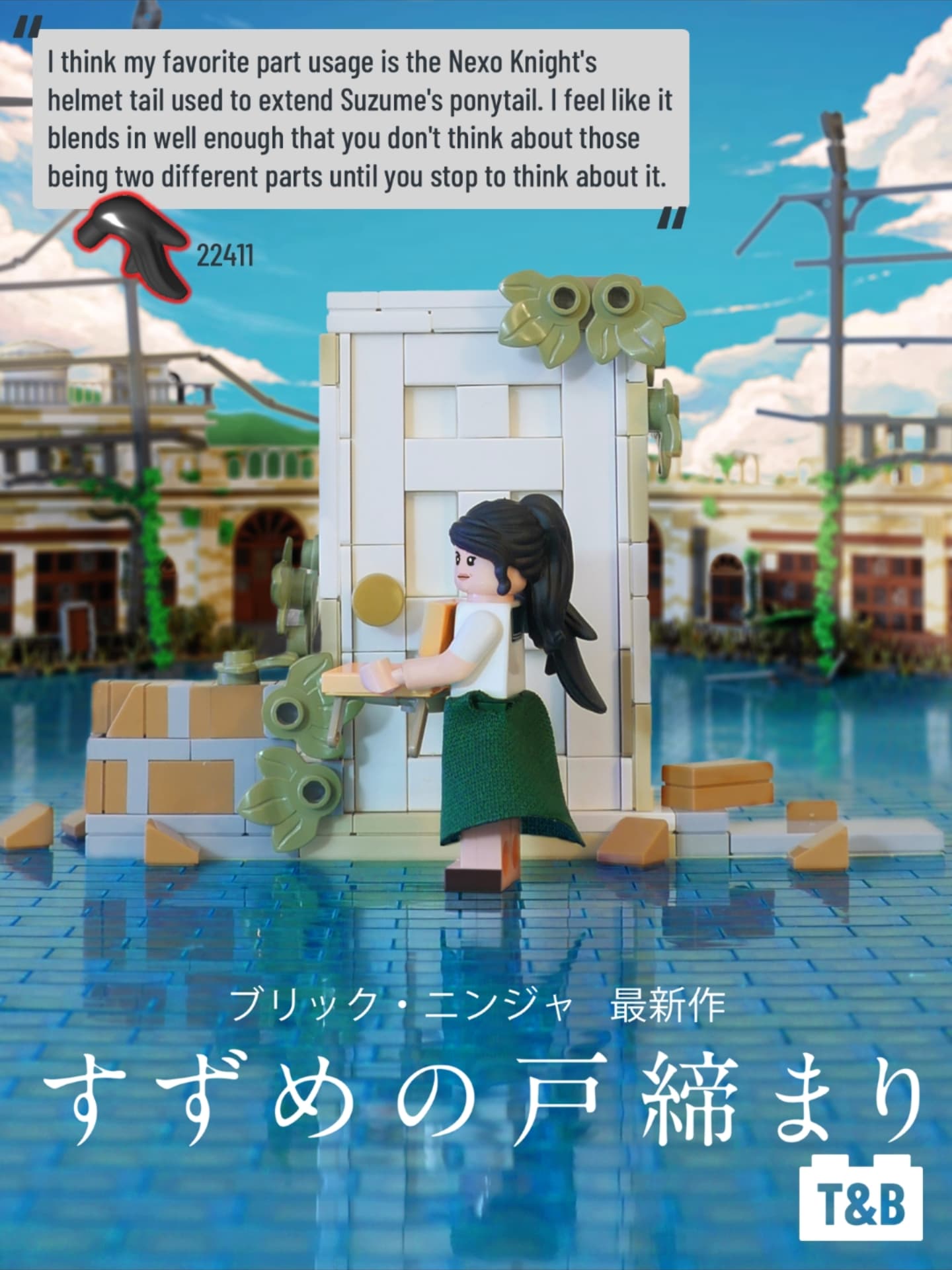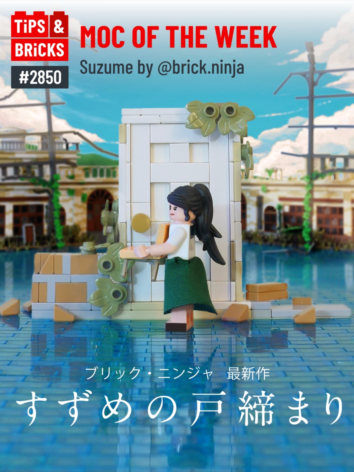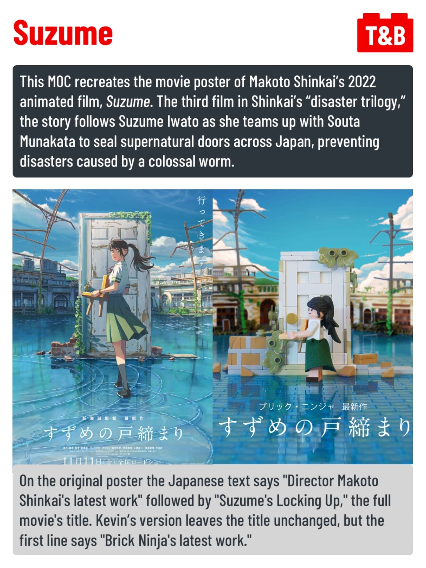 This MOC recreates the movie poster of Makoto Shinkai’s 2022 animated film, Suzume. Check out the use of forced perspective and additional insight from Kevin on figuring out the scale.