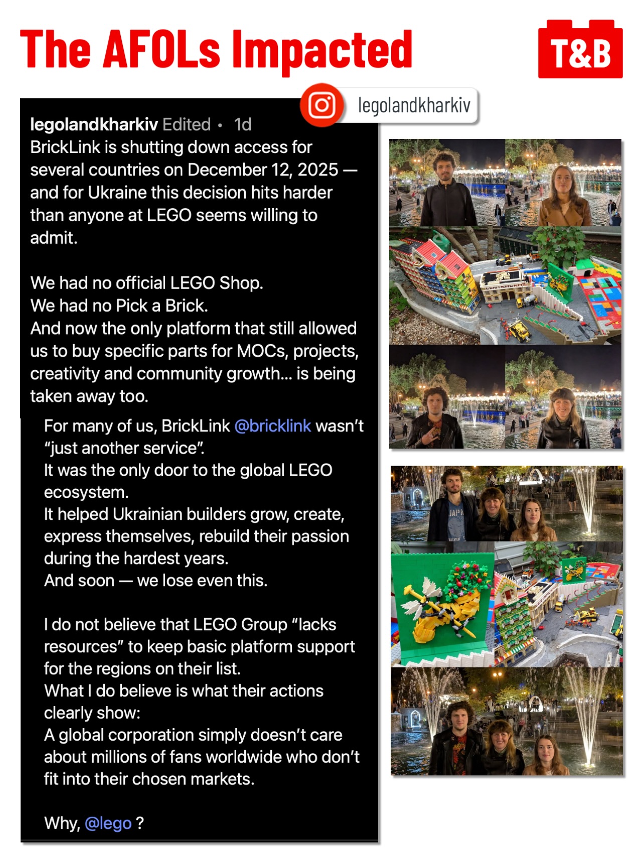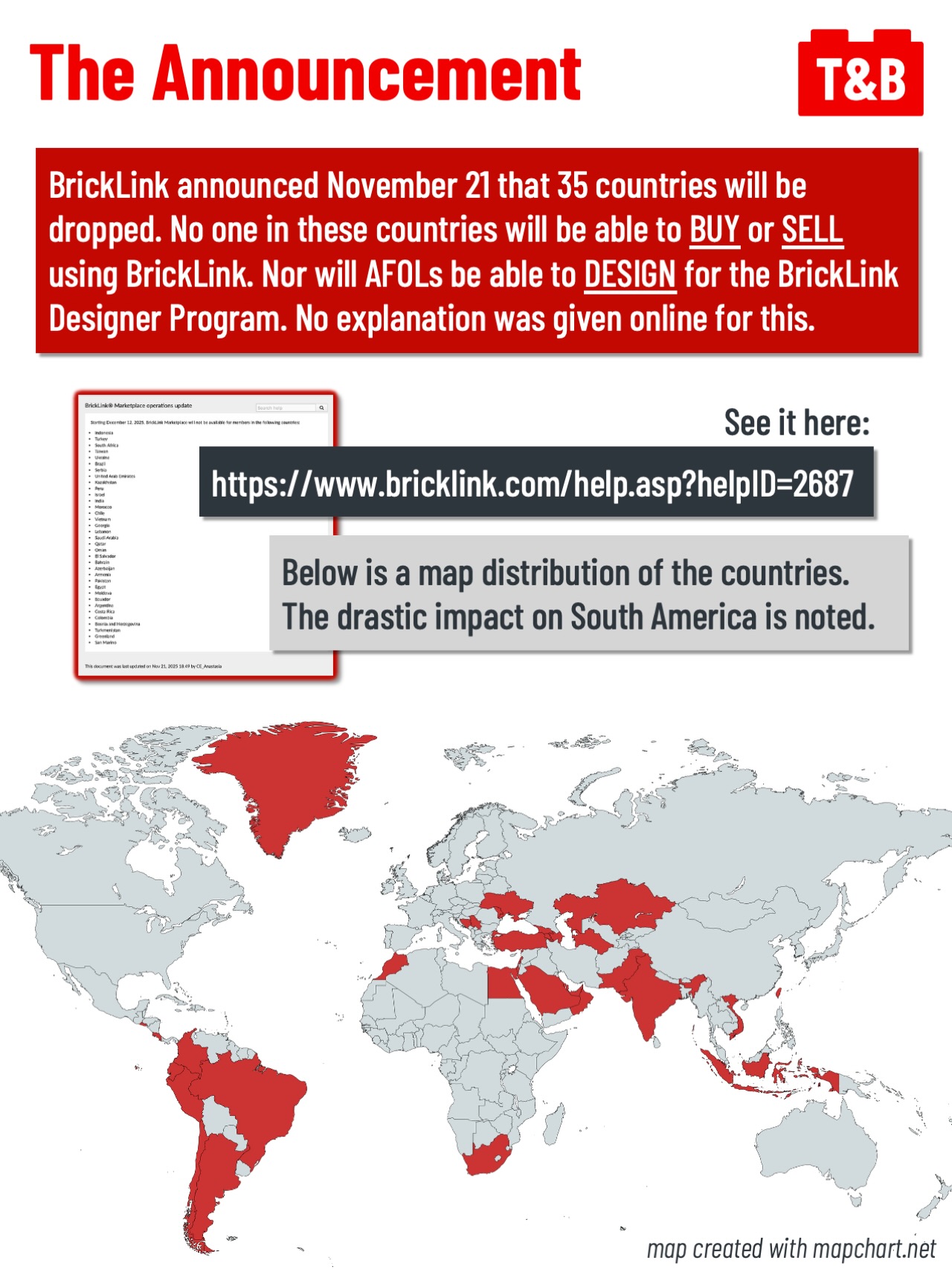 @BrickLink announced November 21 that 35 countries will be dropped on December 12. No one in these countries will be able to BUY or SELL using BrickLink. Nor will AFOLs be able to DESIGN for the BrickLink Designer Program. No explanation was given online for this.