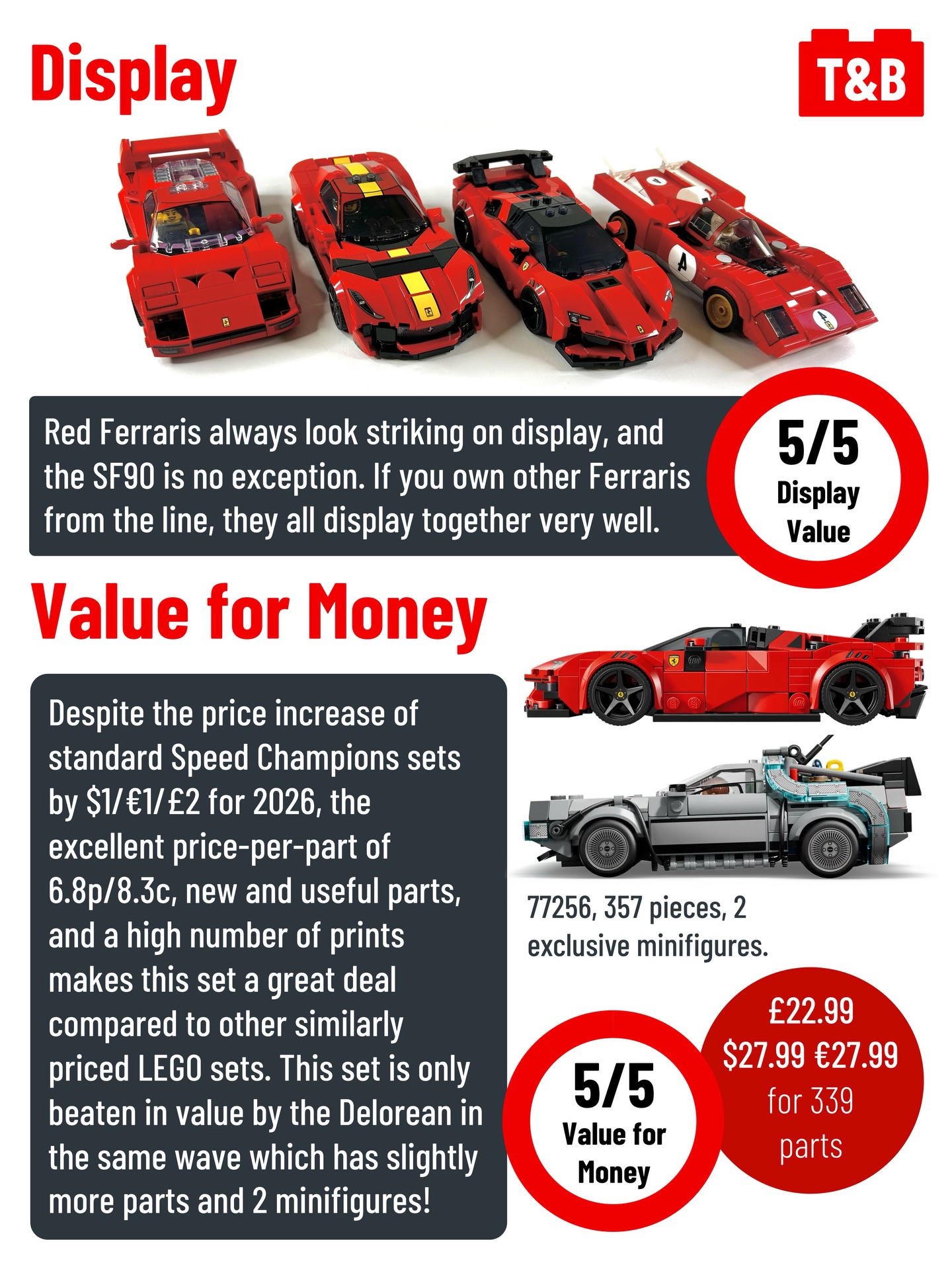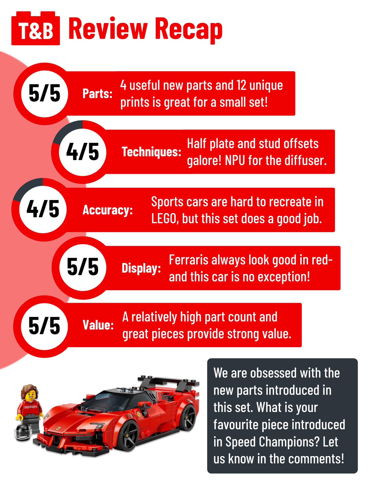 Red Ferrari vehicles are very common in the Speed Champions theme, with 13 sets so far. Does this sleek sports car stand out?