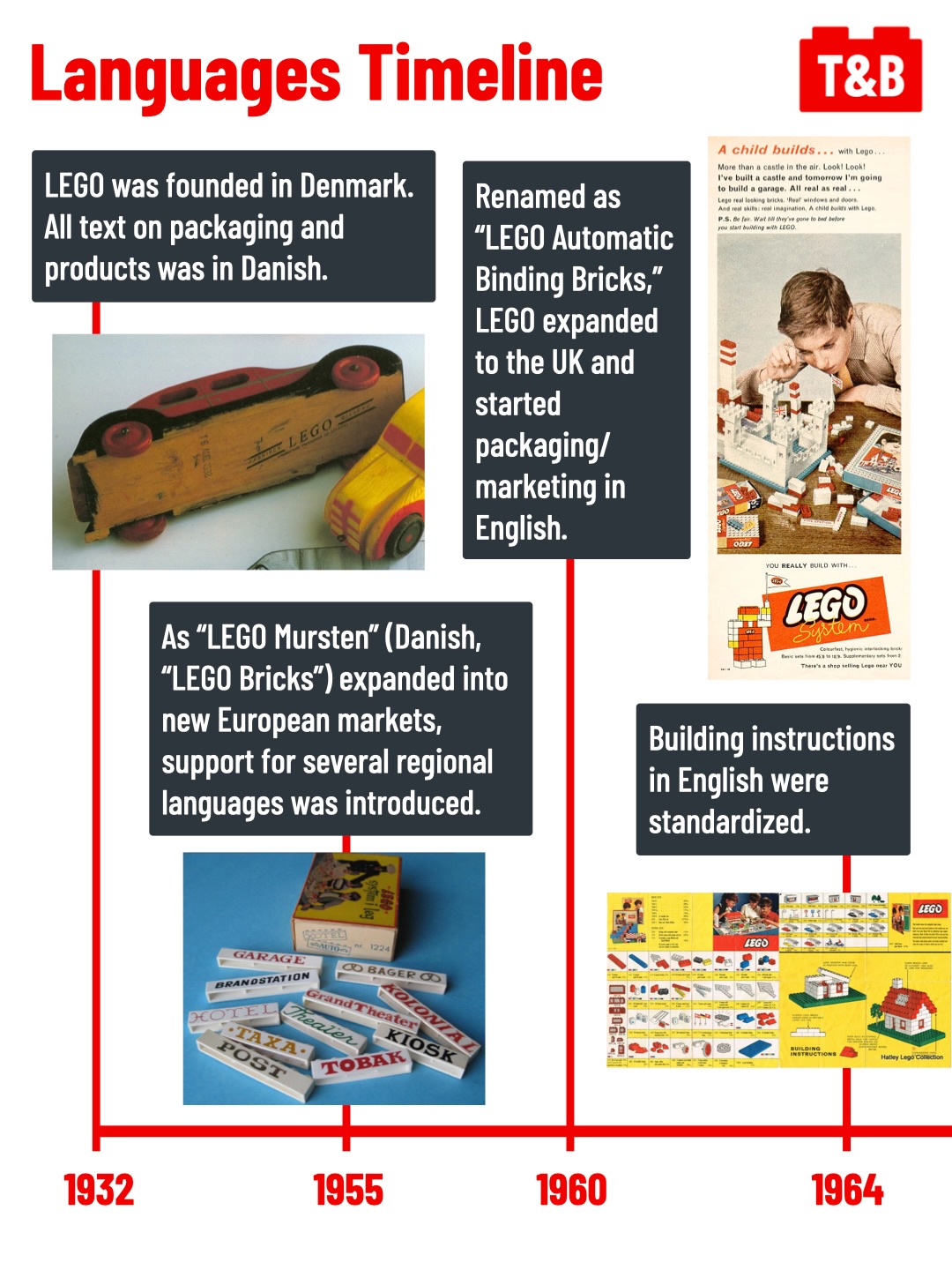Once, all LEGO products were described, printed, and packaged with Danish text. Yet today, most LEGO products have English text on them. Ever wonder how we got to where we are? Today’s post aims to explain just that!