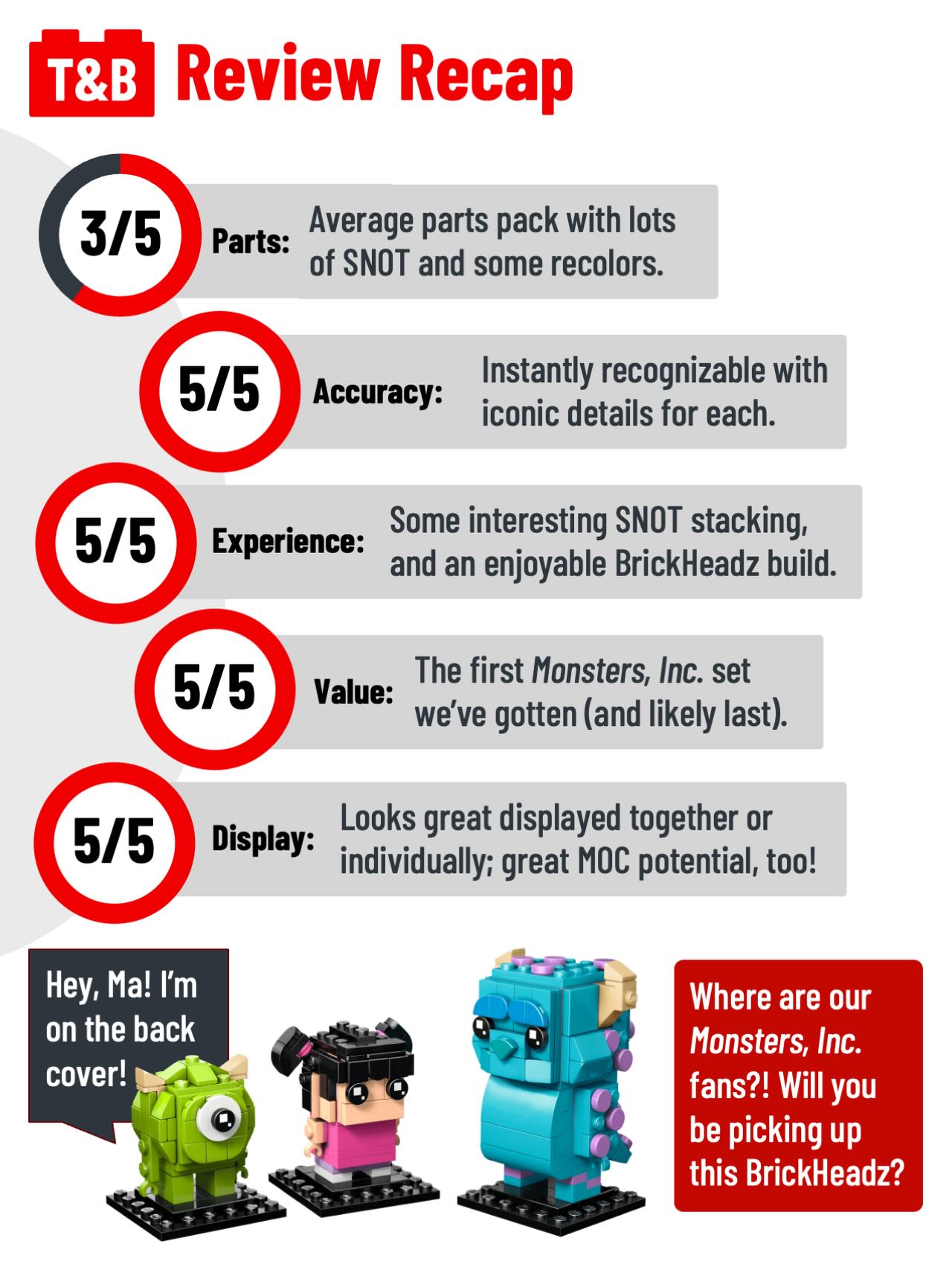 Now here’s a set to scream for! Join us as we enter the doors of Monsters, Inc. and learn how to disguise Boo in her monster costume! Believe it or not, Monsters, Inc. is celebrating its 25th (!!) anniversary. We’re happy to see LEGO celebrating with a set and it was a thoroughly enjoyable build, scoring 22/25: