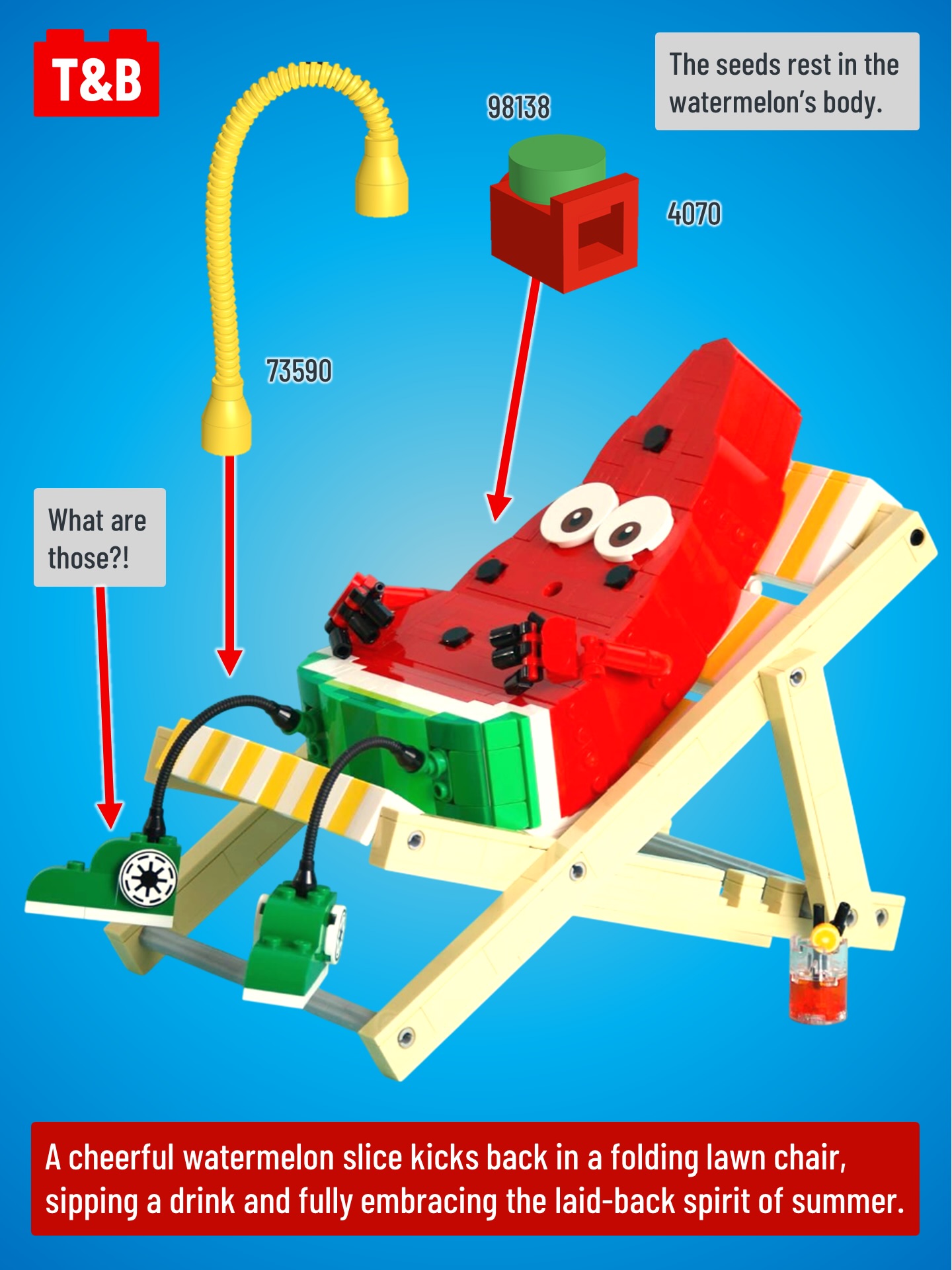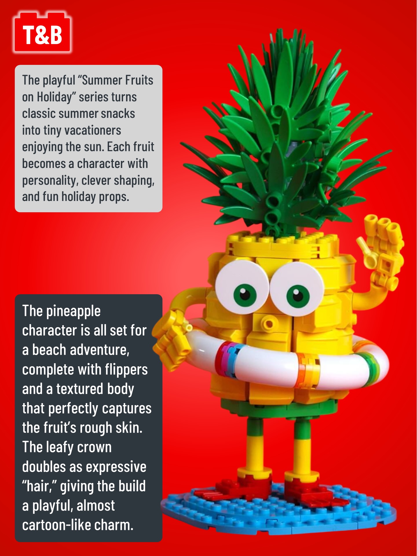 Each tiny build is packed with clever shaping and playful character, turning everyday fruit into charming holidaymakers. Keep an eye out for the inventive techniques used to capture textures, slices, and rinds in brick form. Small details — like beach gear and relaxing poses — help bring each scene to life.
