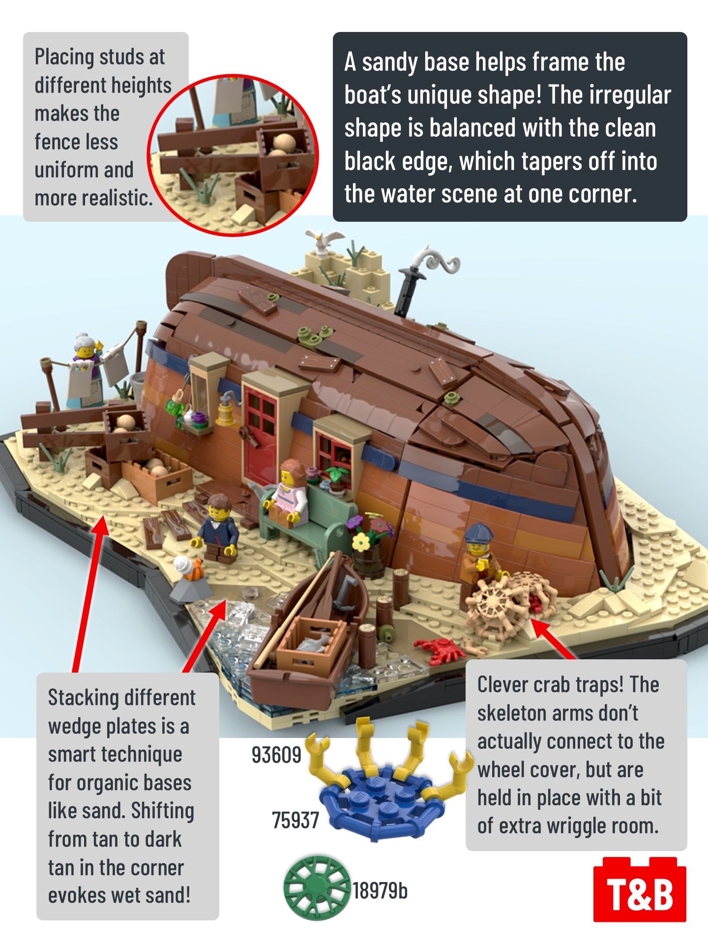 The boat-turned-cottage rests upside down on a sandy beach scene covered with evidence of family life, from crab traps to clotheslines and more. There’s even a hidden function to activate the light brick inside!