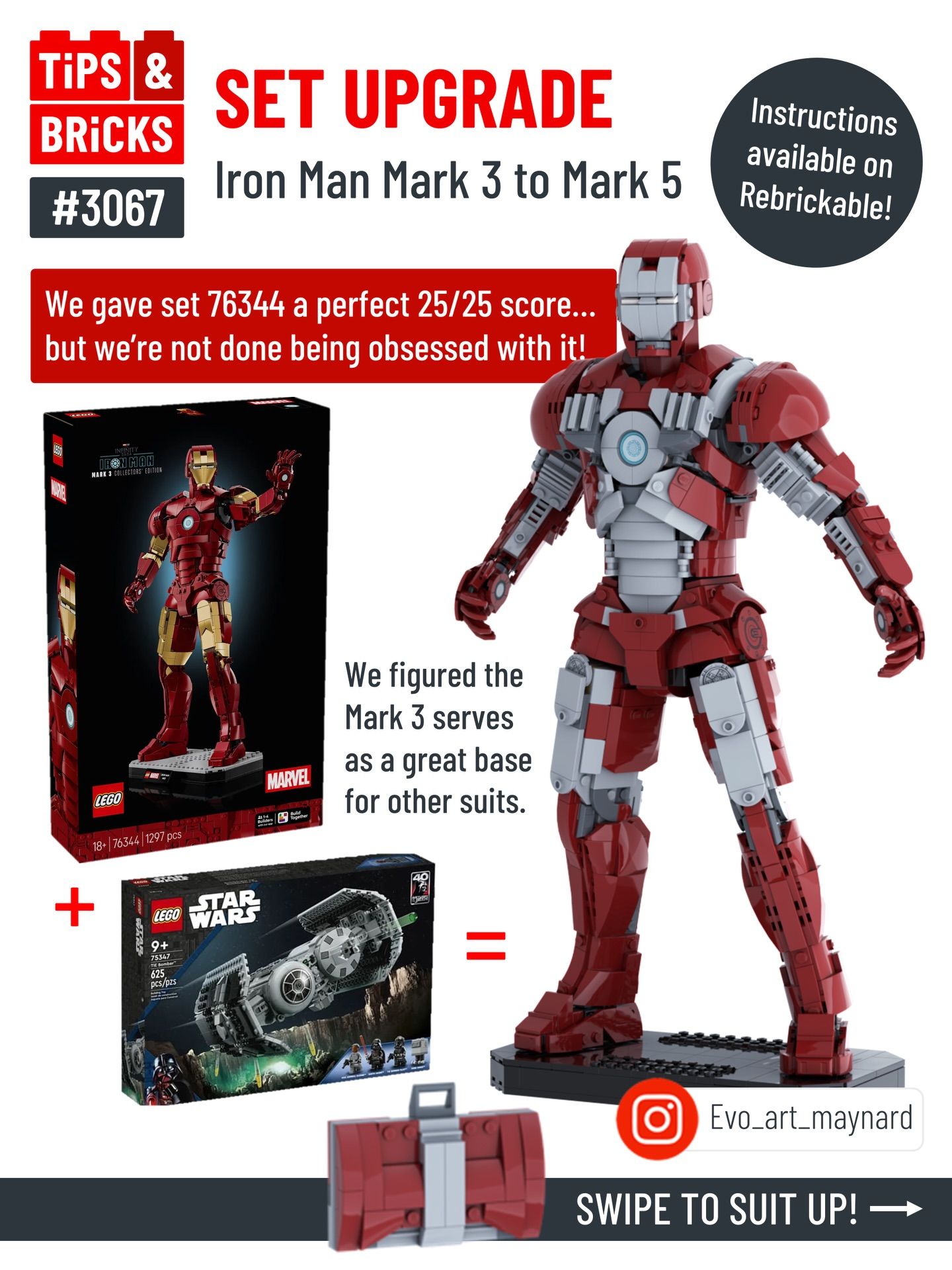 We gave the Iron Man Mark 3 Collectors’ Edition a perfect 25/25 score, and we’re still not done being obsessed with it. Using only parts from another set (so it’s easier to manage the added parts), set 75347 TIE Bomber, one of our master builders @evo_art_maynard has used the Mark 3 as a base for another iconic Iron Man suit, the Mark 5 “suitcase” suit.