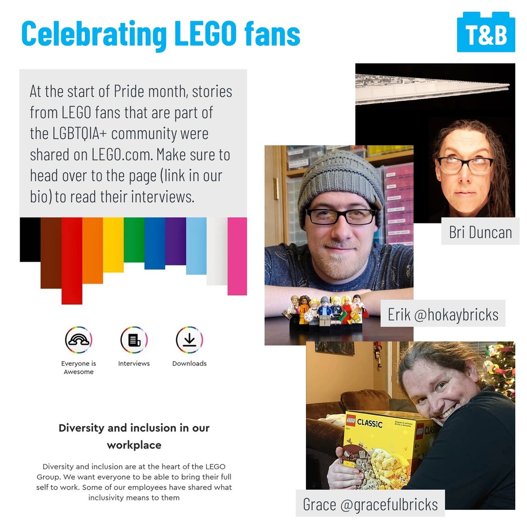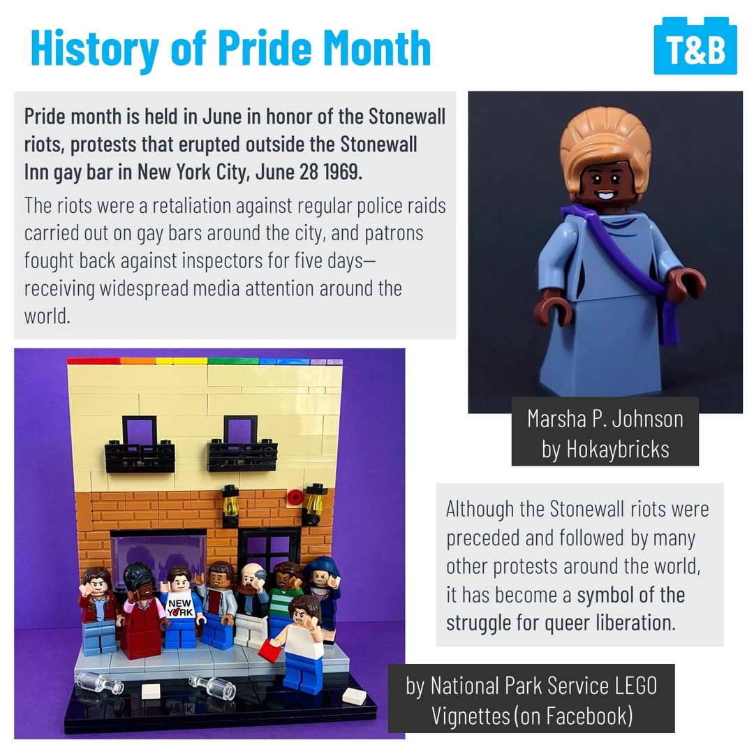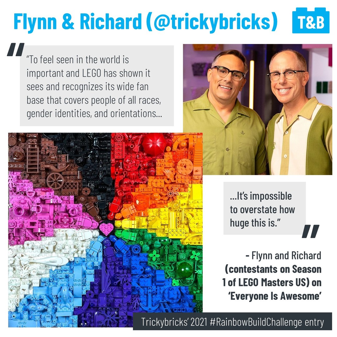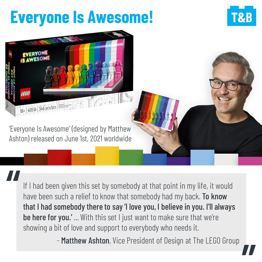 June is LGBTQIA+ Pride Month and what is now a celebration of life and love started as a riot and a protest against unfair and habitual targeting of the important places of gathering for the LGBTQIA+ community. This relates to LEGO because everyone should feel welcome and safe in this fan community to be exactly who they are and historically this has not always been the case. The LEGO Group has even produced a new set saying people should be proud to be themselves exactly as they are. ‘Everyone Is Awesome’ was designed by VP of Design Matthew Ashton (@matthew__ashton) and is now available worldwide. Additionally, LEGO Masters (US) Season 1 contestant’s Flynn and Richard (@trickybricks) offered their thoughts on the set to us as well.